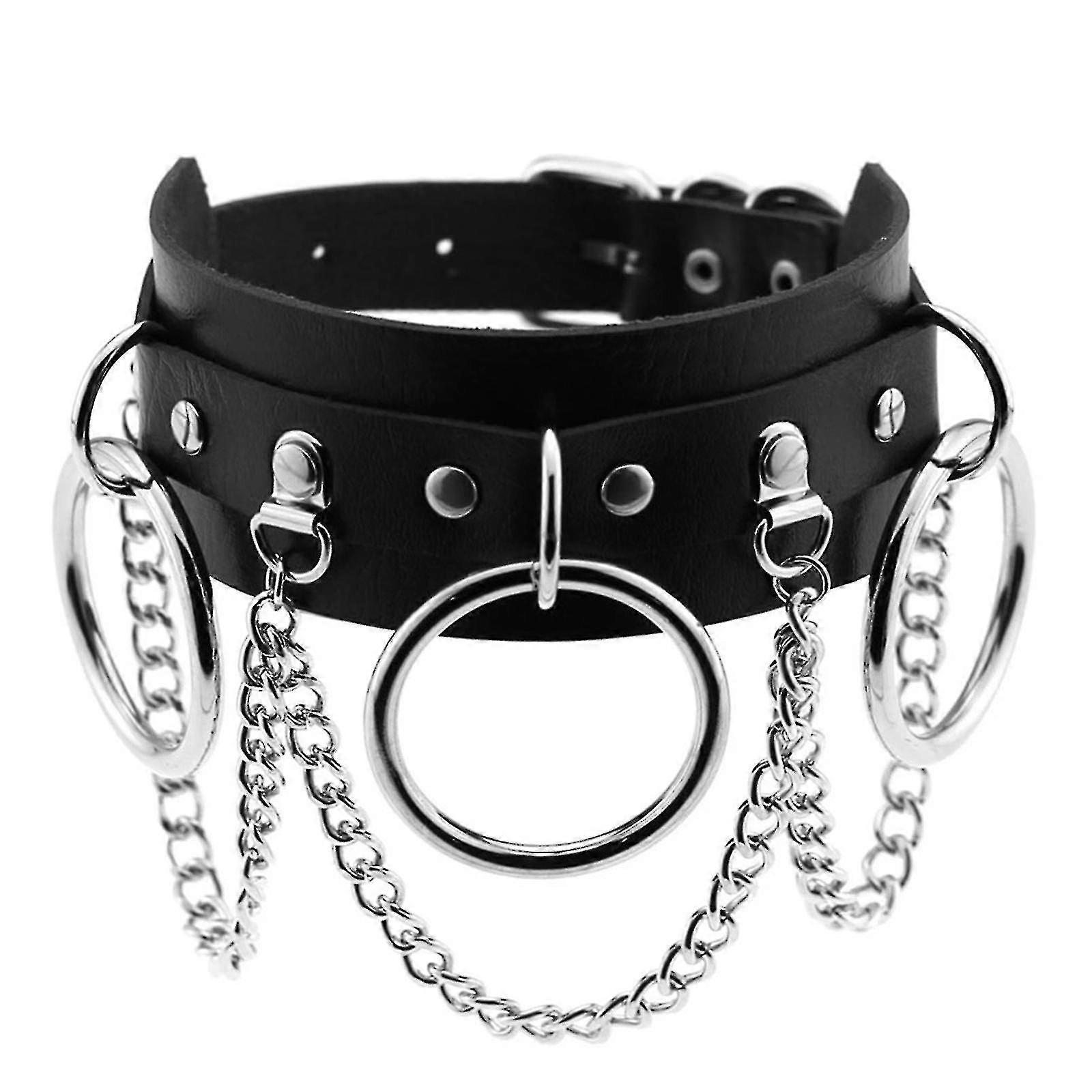 Leather Choker Metal Ring Chain Necklace, Adjustable Punk Collar Chain -n204