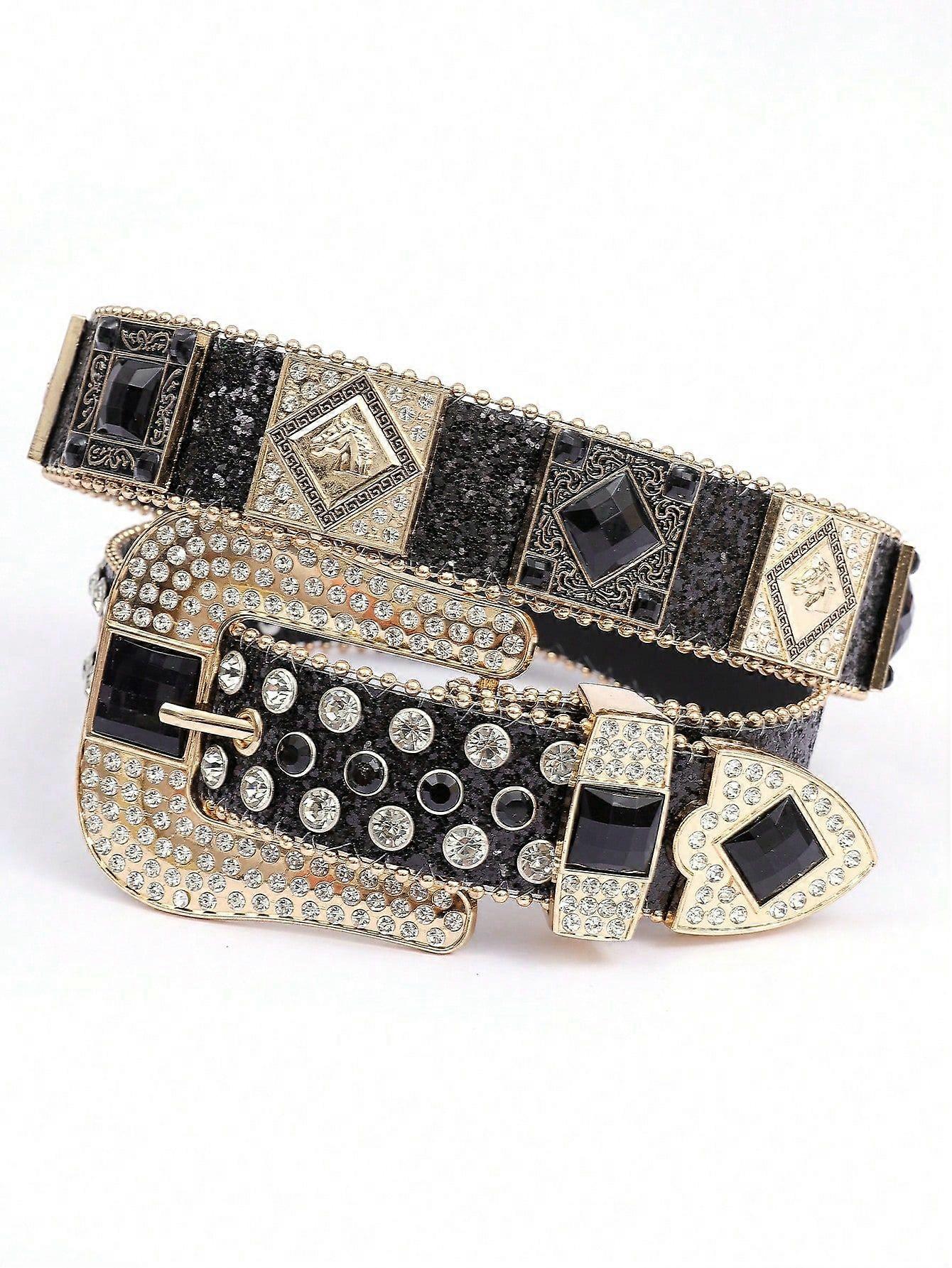 1pc Solid Color Punk Rock Belt Inlay With Rhinestones And Sequins, Stylish Street Fashion Unisex Belt