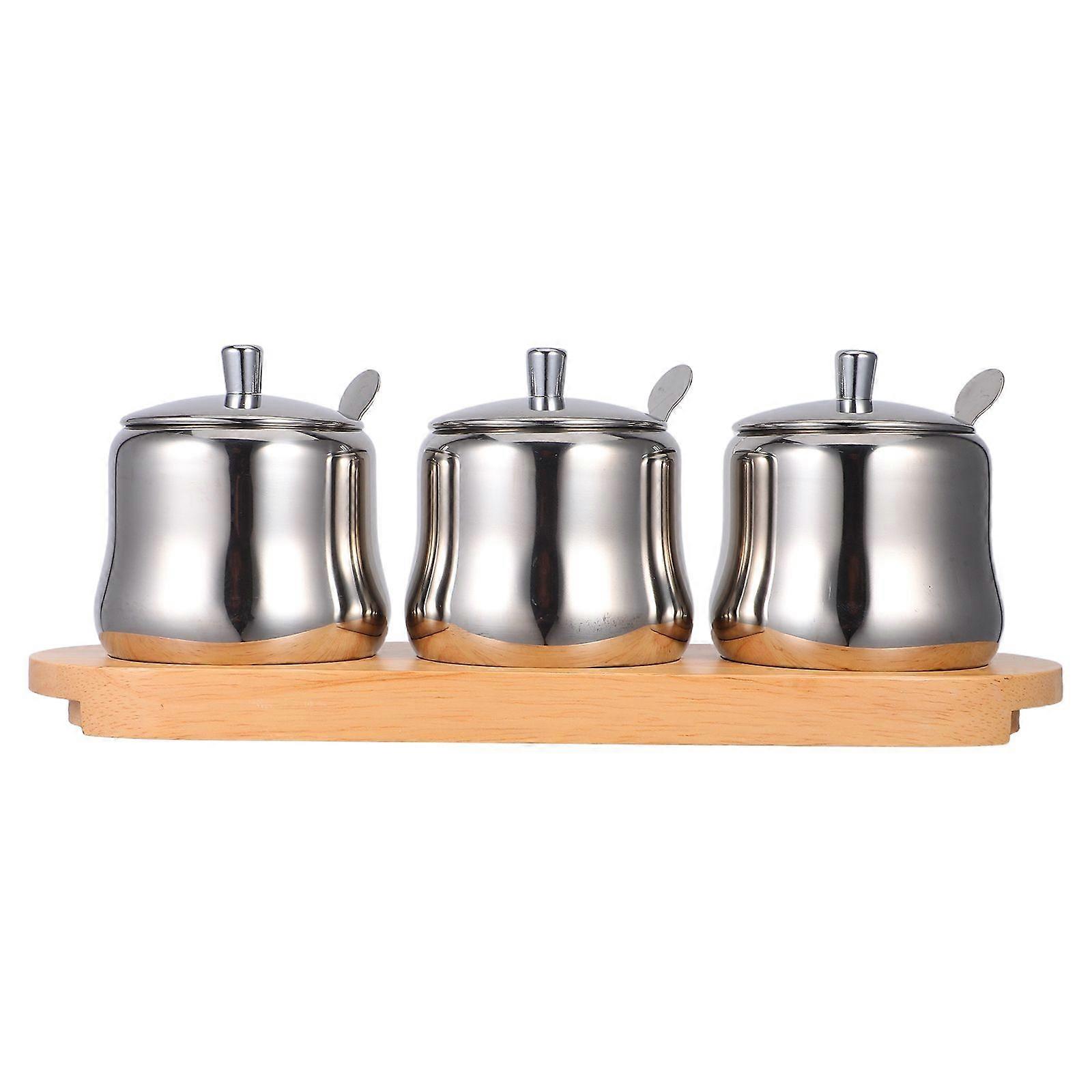 1 Set Stainless Steel Condiment Jar with Spoon and Lid Kitchen Seasoning Container Sugar Bowl with Wood Tray Set for Kitchen Cooking