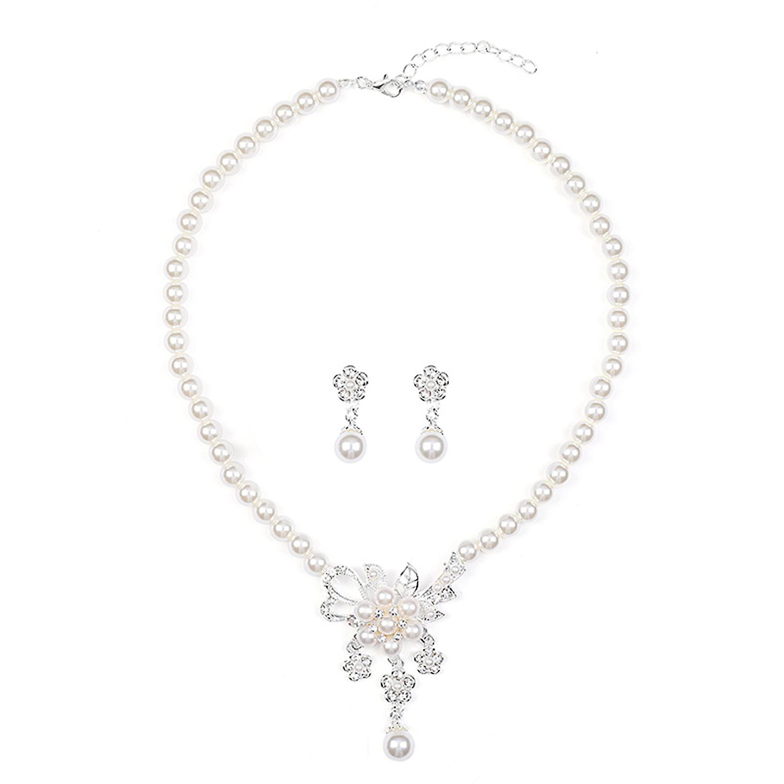 1 Set Women Necklace Beaded Glossy Faux Pearls Rhinestone Embedded Flower Bride Necklace Stud Earrings Kit Wedding Jewelry
