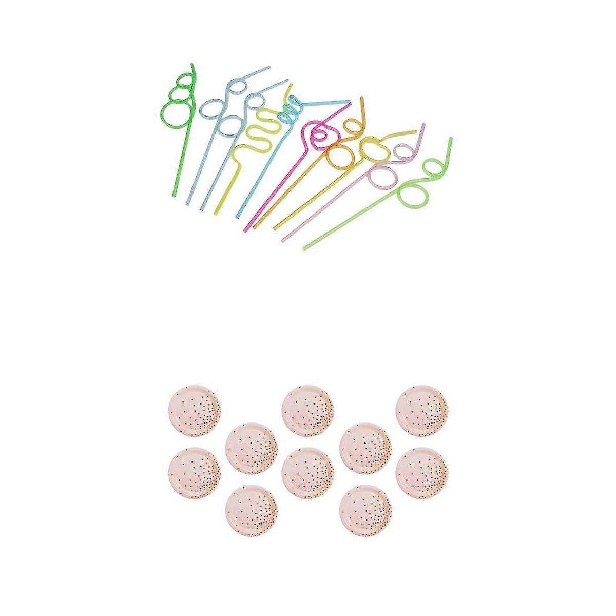 10 Pieces Curly Drinking Straws +10 Pieces Gold Spots Paper Plate