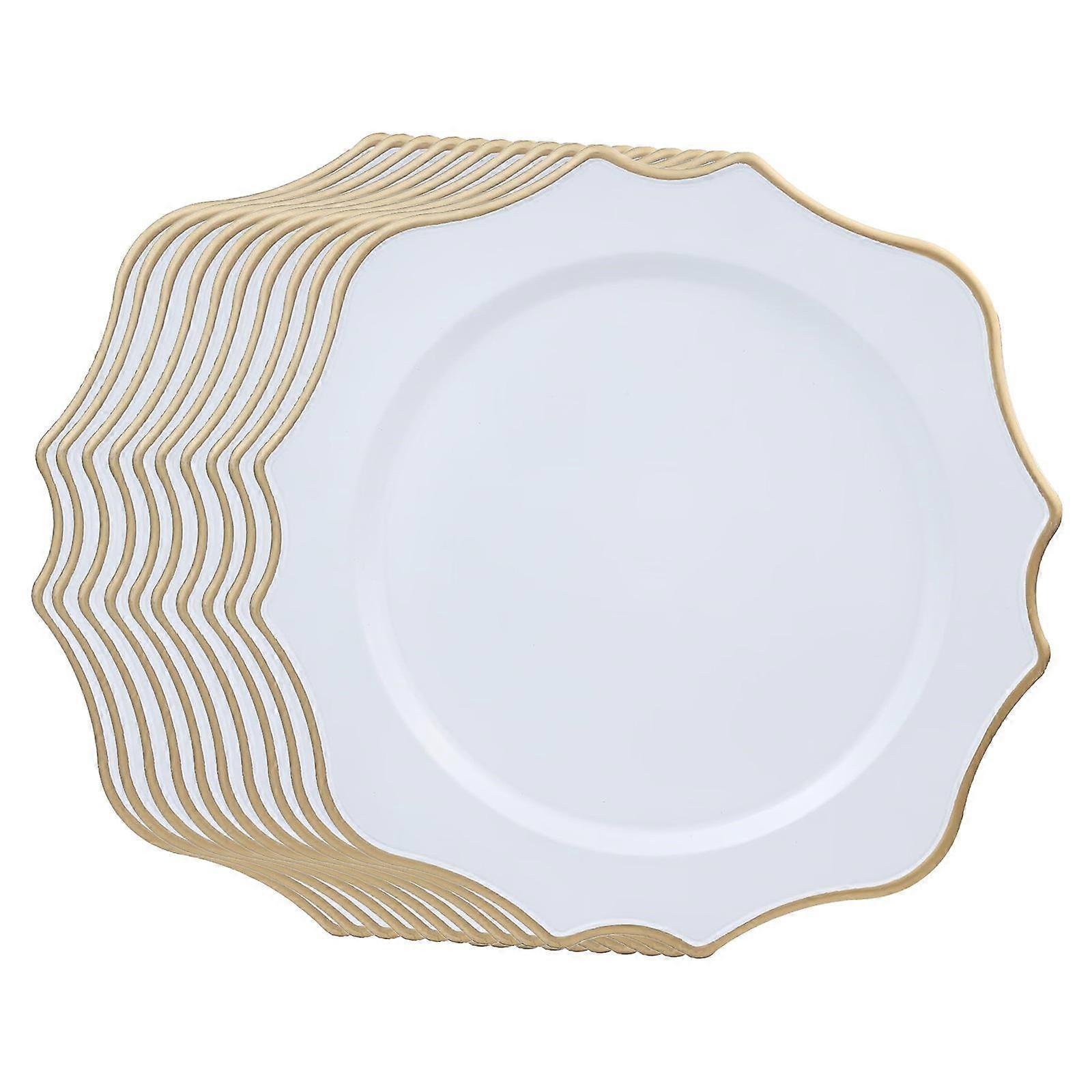 Description: 【Size】: These Charger Plates measure 33cmx33cm, providing ample space for any dish you wish to serve. 【Package Included】: 10pcs charger plates, suitable for hosting dinner parties or family gatherings, wedding, holiday dinner, anniversary, birthday party, hotel and other places. 【Durable Material】: Dinner Plates is made from durable material, elegant appearance, unbreakable. 【Prevent Overflow】: The plate can prevent overflow, protect the table and tablecloths from being soiled during use, and also make your dining table setting elegant and unique. 【Elegant Setting】: This exquisite plate is designed with a classic flower edge and is a great addition to your tableware collection. Exquisite craftsmanship for dinner or wedding table decoration. Size Chart: 33cmx33cm/12.99inchx12.99inch Package Includes: 10 Charger Plates Note: Please allow slightly errors due to manual measurement and different monitors.