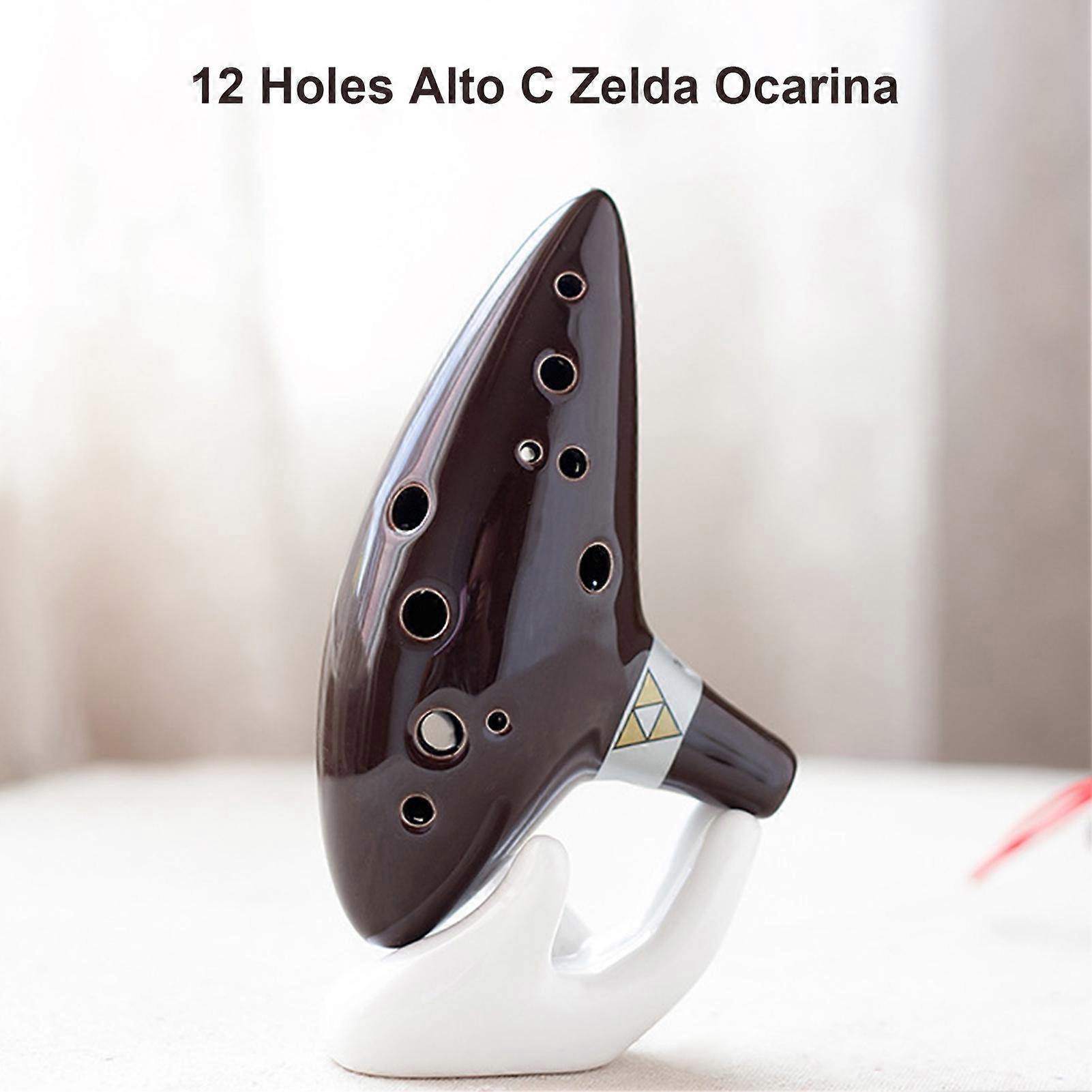12 Holes Alto C Ocarina Ceramic Vessel Flute Wind Musical Instrument with Musicbook Lanyard Display Stand Musical Gift for Beginners