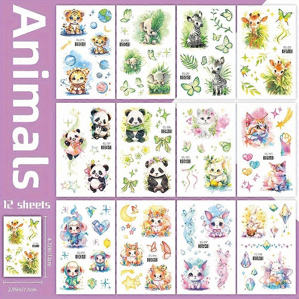 12 pack glitter animal temporary tattoo stickers, waterproof cartoon Jungle Zoo animals, panda, rabbit, sheep, tiger, elephant,