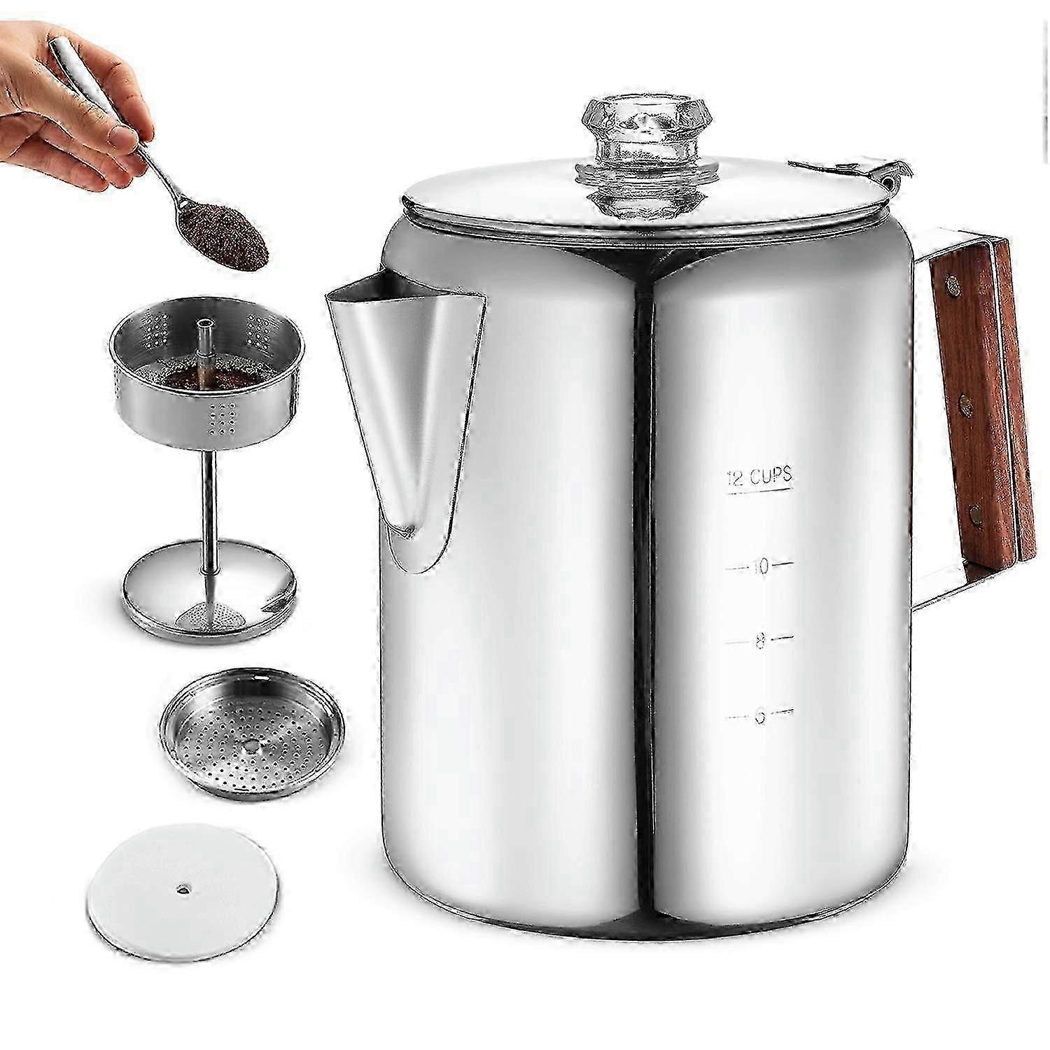 12-Cup Stainless Steel Percolator for Stovetop Camping Brewing, Outdoor Coffee Pot with Measurement Marks for Outdoor & Home Brewing