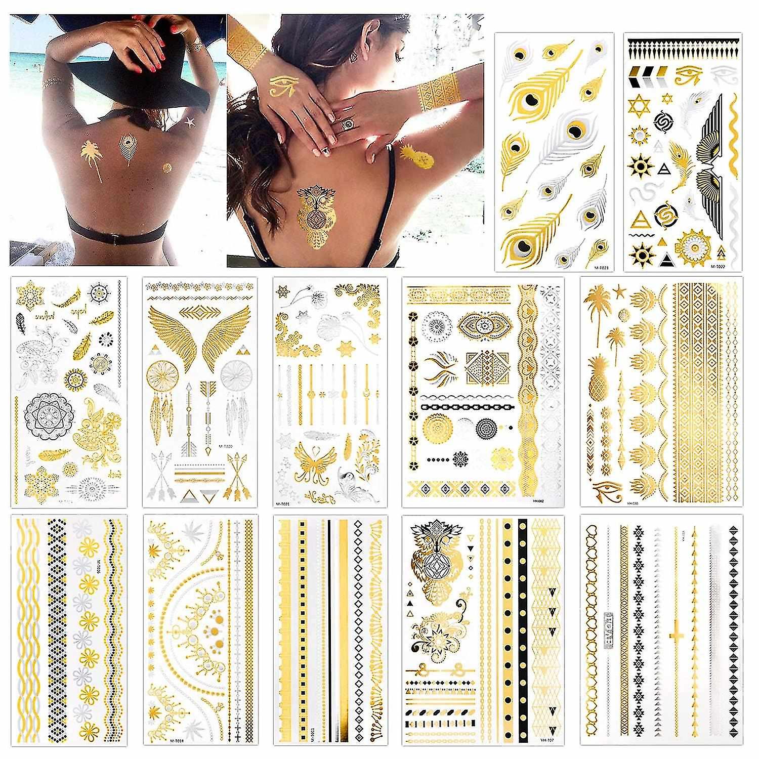 12 Sheets Metallic Temporary Tattoos, 150+ Shimmer Designs Black Silver Gold Temporary Tattoo Jewell