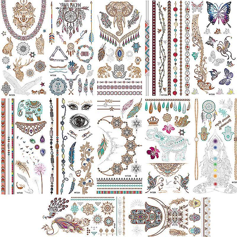 12pcs Metallic Temporary Tattoos Gold Silver Temporary Tattoos Glitter Shimmer Designs