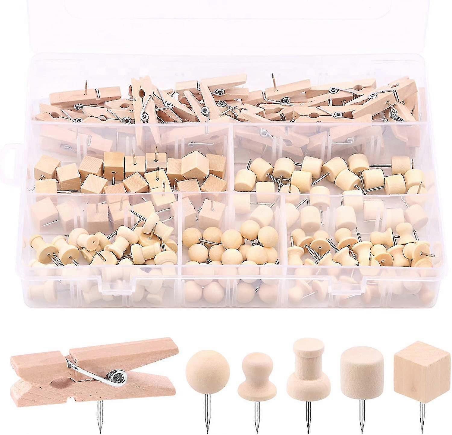 135pcs 6 Types Wood Push Pins Assortment Kit, Wooden Head Pins Steel Thumb Tacks Clips Push Pins For Cork Boards