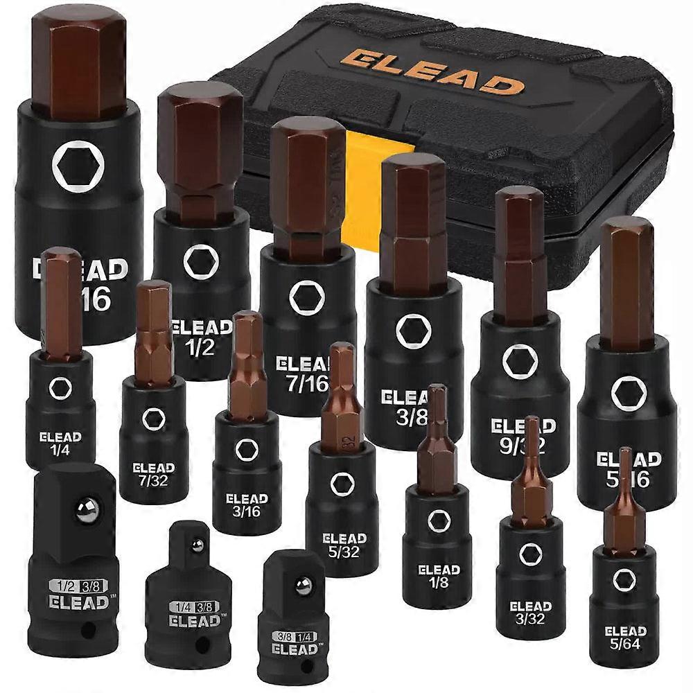 Multi-Size Coverage This 16-Piece Set Covers All Your Needs Including 1/4" Drive (5/64 3/32 1/8 5/32 3/16 7/32 1/4) 3/8" Drive (9/32 5/16 3/8 7/16 1/2) And 1/2" Drive (9/16) Plus 3 Socket Adapters. Each Socket Features A Detent Pin Hole For Added Stability And Precision. Durable Build Made From Premium S2 Steel And Chrome Vanadium Steel This Set Delivers Exceptional Strength And Durability For Tough Automotive And Mechanical Tasks. Precision Fit Precision-Machined Tips And Chamfered Edges Ensure Smooth Insertion Protecting Both Fasteners And Sockets For A Perfect Secure Fit. Rust-Resistant Blackened Manganese Phosphate Coating Provides Superior Protection Against Rust And Corrosion Extending Tool Life. Easy Storage Each Socket Is laser-Etched With Clear Size Markings And Comes In A Heavy-Duty Case For Quick Identification Organization And Portability Pack Includes: 1X 16Pcs Sae Hex Bit Socket