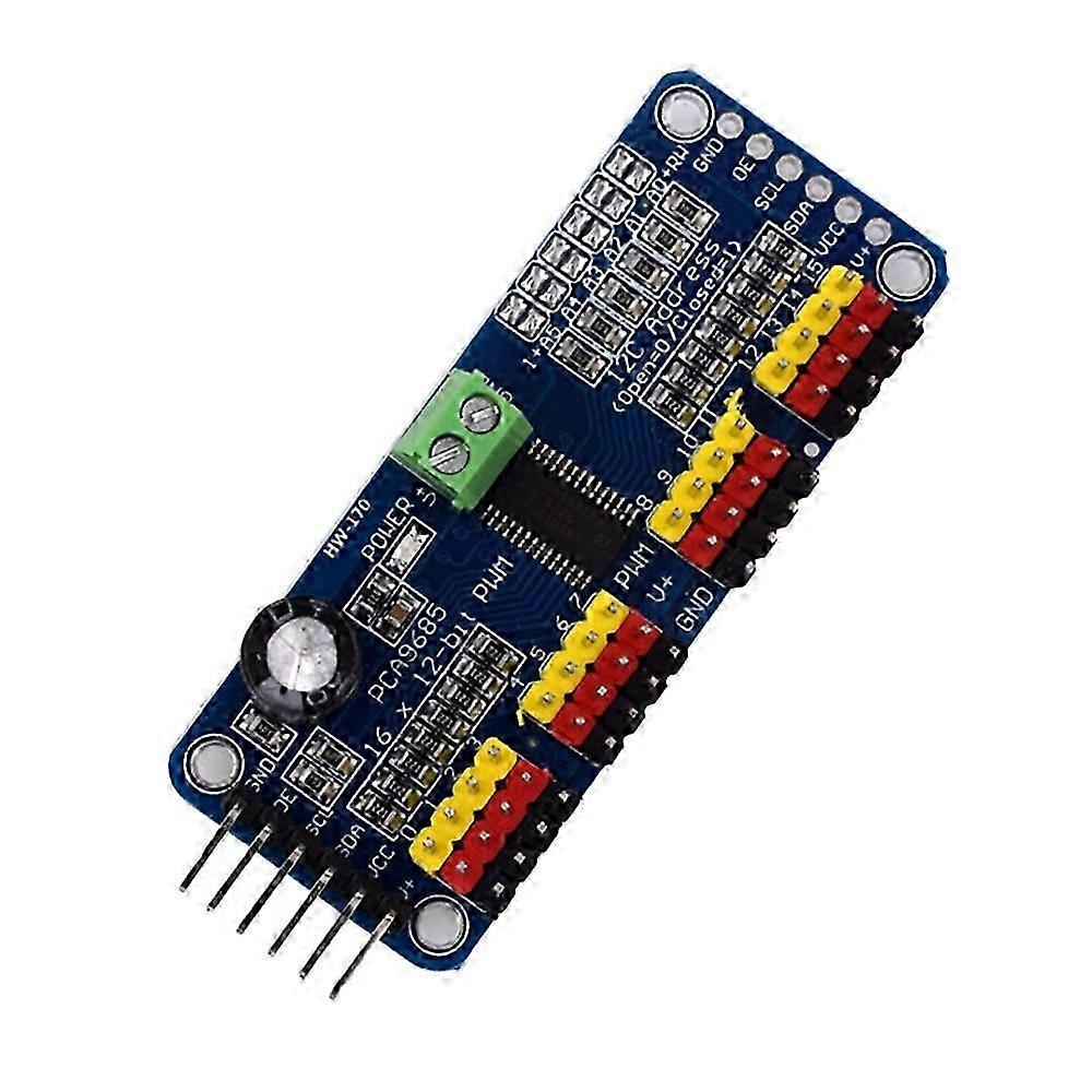 This is a built-in PWM driver and a clock using i2c communication. This means that this will be very different from the TLC5940 series. You don't need to constantly send signals to occupy your microcontroller! It is 5V compatible, which means you can also control it with a 3.3V microcontroller and safely drive it to the 6V output (3.4+ positive voltage is also ok when you want to control the white or blue LEDs) The 6 address select pins allow you to hook up 62 driver boards on a single i2c bus, for a total of 992 PWM outputs. That would be a very large resource. About 1.6Khz adjustable frequency PWM output Ready to output 12-bit resolution for stepper motors, which means 4us resolution at 60Hz update rate Configurable push-pull or open-circuit output Output enable pin quickly disables all outputs The PCA9685 chip is wrapped in the center of the small board Power input terminal Green power indicator It is convenient to insert 16 servo motors at a time in 4 sets of 3-pin connectors (the plug of the servo motor is slightly than 0.1inch, so you can put 4 pairs of 0.1inch connectors) Input reverse polarity protection on terminal block Cascade design Put a large capacitor on the V+ line (you will need it in some cases) The peripheral input voltage depends on this 10V1000uf capacitor Put a 220 ohm series resistor on all PWM output lines to protect them and drive LED easily. Colour: blue Material: PCB Size: 60x25mm Package Contents: 1 * Servo driver board Only the above package content, other products are not included. Note: Light and different displays may cause the color of the item in the picture a little different from the real thing. The measurement allowed error is +/- 1-3cm.