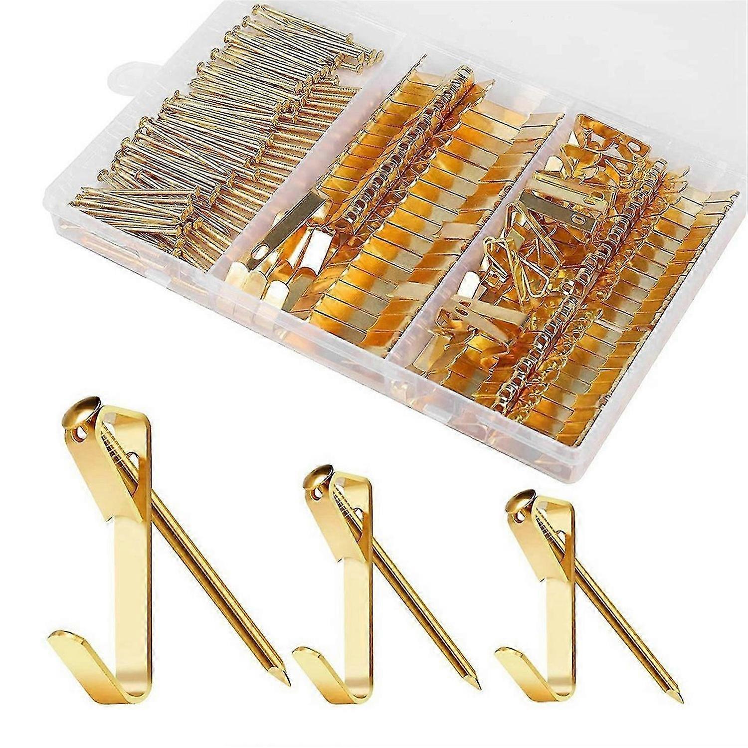 Great Assortment: You receive 90 sets of picture hanging hardware, including 20 sets of 50LB hooks,50 sets of 30LB hooks, and 20 sets of 20LB hooks with 94 nails, With different 3 sizes of professional hanging kits very convenient. : The golden Picture Hanging Kit is made of high-quality iron metal, and the appearance is a layer of copper metal wrapping. Essential hardware kit Picture suspension kit, perfect for home projects and decorative projects. Reliable thickness: The body of the Picture Hanging Kit is thickened, and more . If the wall is hard enough, hanging something light work well. Nails are not easy to bend, and easy to hang clutter firmly . The picture hangers are small and practical, and it is easy to recycle, leaving a small hole. Scope of application: Picture Hanging Kit is applicable to the living room, dining room, bedroom, studio, and doorway, and you feel suitable for each place, Picture Hanging Kit is suitable for hanging plates, photos, postcards, wedding photos, clocks, calendars, posters, small hanging ornaments, and other small items. Good packaging: Picture hangers come in reusable plastic boxes that are perfect for storage and are easy to use without being found and messed up. A total of 184 accessories, including picture hanging hooks, nails, etc.<br><br>Tips:The product may be updated constantly ,Due To Different Batches, The Actual Product May Have Slight Differences Or Color Differences, Which Does Not Affect Use Colour:Gold Material:Metal<br><br>Package Contents: 184 * Picture Hanging Kit<br><br>Only the above package content, other products are not included. Note: Light reflection and different displays may cause the color of the item in the picture a little different from the real thing. The measurement allowed error is +/- 1-3cm.