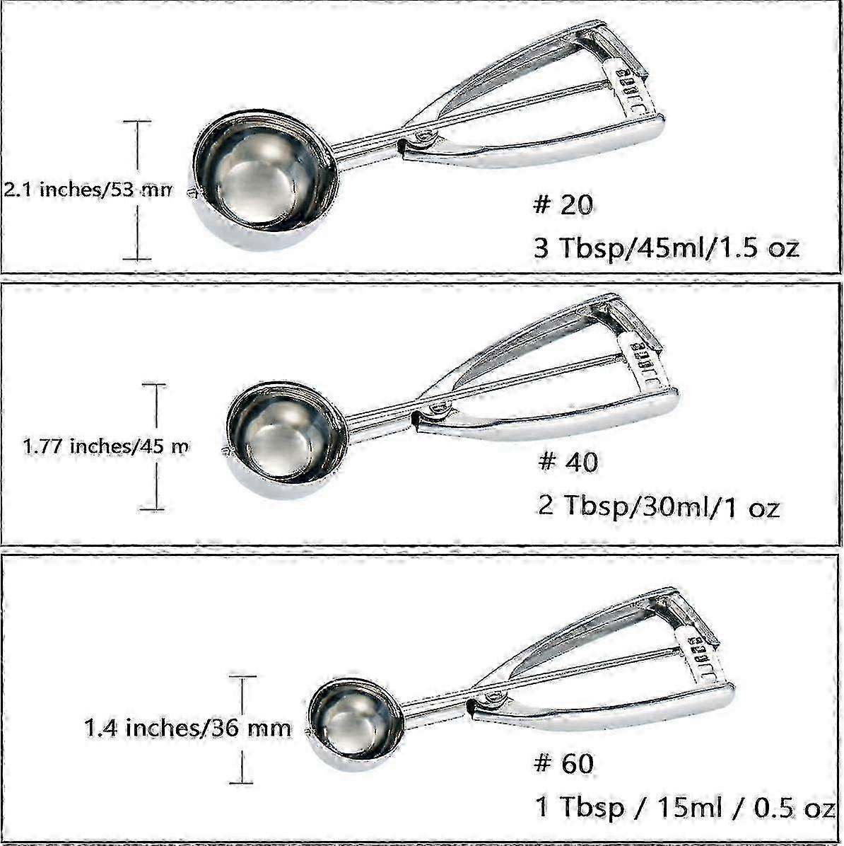 1.INCLUDE 3 DIFFERENT SIZES, MULTIPLE USES - The cookie scoop set includes Small cookie scoop, 60 scoop (1 Tbsp/15ml/0.5 oz), medium cookie scoop, 40 scoop, (2 Tbsp/30ml/1 oz), large cookie scoop, 20 scoop, (3 Tbsp/45ml/1.5 oz). Perfect size for cookie, cupcake, muffin, ice cream, pancake. 2.TOP QUALITY, MADE OF 18/8 STAINLESS STEEL - The cookie scoops for baking are made of premium quality 18/8 stainless steel, thickened spoon ball and thickened handle, which means the cookie scooper will last longer, without worrying about breaking or bending easily. 3.EFFICIENT TRIGGER SYSTEM, EASY TO USE - With innovative cog-and-ratchet system, the trigger is more efficient and practical. We don't need much effort to squeeze to easily release cookie dough. The cookie scoopers fit comfortably in the left or right hand. 4.SAFE FOR FOOD, SUPER KITCHEN HELPER - Made of food-grade stainless steel, We will not worry about leaving harmful substances in food. The cupcake scoops are perfect for cookie, ice cream, meatball, waffle, pancake batter, muffin, cupcake, bonbons and others. 5.EASILY CLEAN, DISHWASHER SAFE - Hand wash and dishwasher is safe. The cookie scoops set of 3 will always stay their gleaming shine after wash. The ice cream scoop with trigger are stain-resistant, and wont pit, rust or corrode, different from other inferior stainless steel.