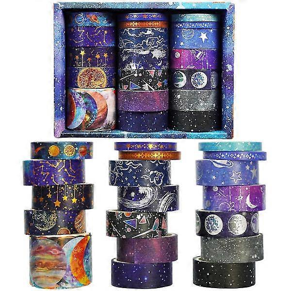Package Contents: 4 x 2.5m x 5mm, 1 x 2.5m x 10mm, 13 x 2.5m x 15mm, 1 x 2.5m x 29mm Highlights Description: [Galaxy Theme] The washi tape features a galaxy-themed design, including the universe, galaxies, constellations, moon, and stars. Decorate anything you like and add artistic fun to your life. [High-Quality Material] This textured tape is made of high-quality paper, sturdy and durable, lightweight and supportive, and not easy to fade. It tears easily by hand and can be stored for a long time. [Easy to Remove] When adjustments are needed, the decorative tape can be easily removed and reapplied without leaving residue, protecting your walls or furniture. It can be adjusted to your liking until you are satisfied. [Mixed Sizes] The package includes 19 pieces of washi tape, including 4 pieces of 2.5m x 5mm tape, 1 piece of 2.5m x 10mm tape, 13 pieces of 2.5m x 15mm tape, and 1 piece of 2.5m x 29mm tape, enough to meet your various decorative needs. [Wide Application] This washi tape is widely used on computer screens, walls, photo frames, books, keyboards, crafts, pens, scrapbooks, photo albums, etc. Unleash your creativity and enjoy the beauty of washi tape. Detailed Description: Product Name: Hezi Tape Product Description: If you like scrapbooking, Hezi Tape is indispensable. Our washi tape comes in a wide variety of sizes and patterns to meet your various decorative needs. With these beautiful washi tapes, you will love your handiwork and make life more exciting and beautiful. Key Features: Modern Design: The washi tape's printed patterns are clear and elegant, combined with bright colors, which are easy to attract others and get lost in our ideas. DIY Crafts: Use these modern masking tapes to enhance your creativity, design with your original and unique hand-painted artwork, and enjoy the fun of DIY. Great Gift: Galaxy-themed decorative tape has a wide range of uses. It's a creative gift for friends who like the galaxy and DIY crafts. Specification: Material: Paper Size: 2.5m x 5mm, 2.5m x 10mm, 2.5m x 15mm, 2.5m x 29mm Quantity: 19 pieces Note: 1. The picture may slightly differ from the actual color of the product. We will try our best to show you the exact color. 2. Due to manual measurement, please allow a slight size difference.
