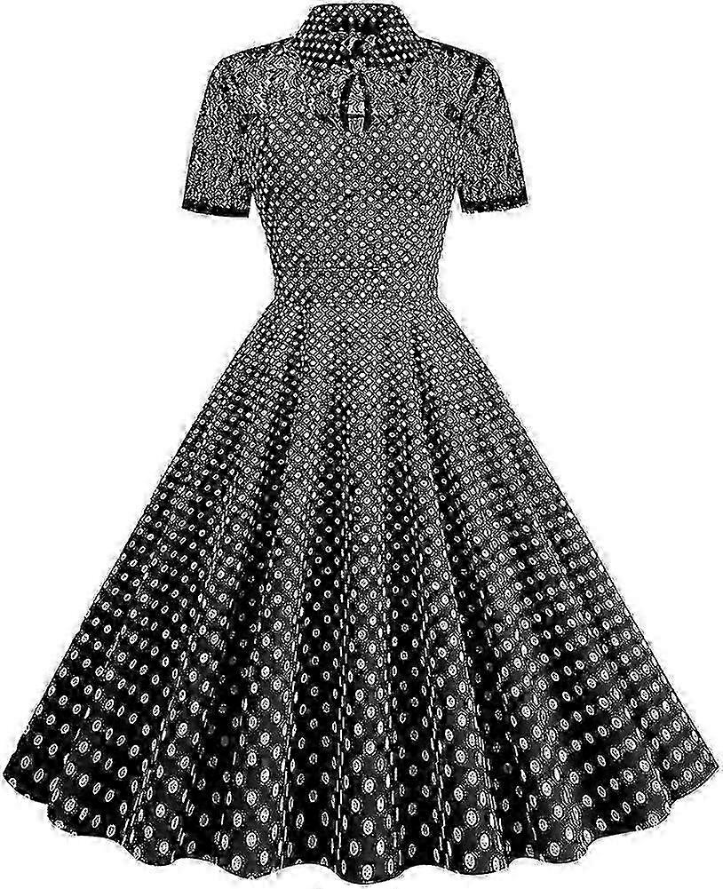 All-over Retro Lace Polka Dot Summer Dress DesignWomen's black floral lace dress retro 50s 60s polka dot print rockabilly cocktail party wedding guest midi swing dresses. Short sleeve summer dresses for women, sheer mesh illusion sweetheart neckline spliced with black floral lace at bodice and sleeves, vintage and charming. Elegant lapel collar, a keyhole cutout and an exquisite button at front, a wide seam at waistline, gentle and gorgeous. Hidden zipper at one side for easy wearing.