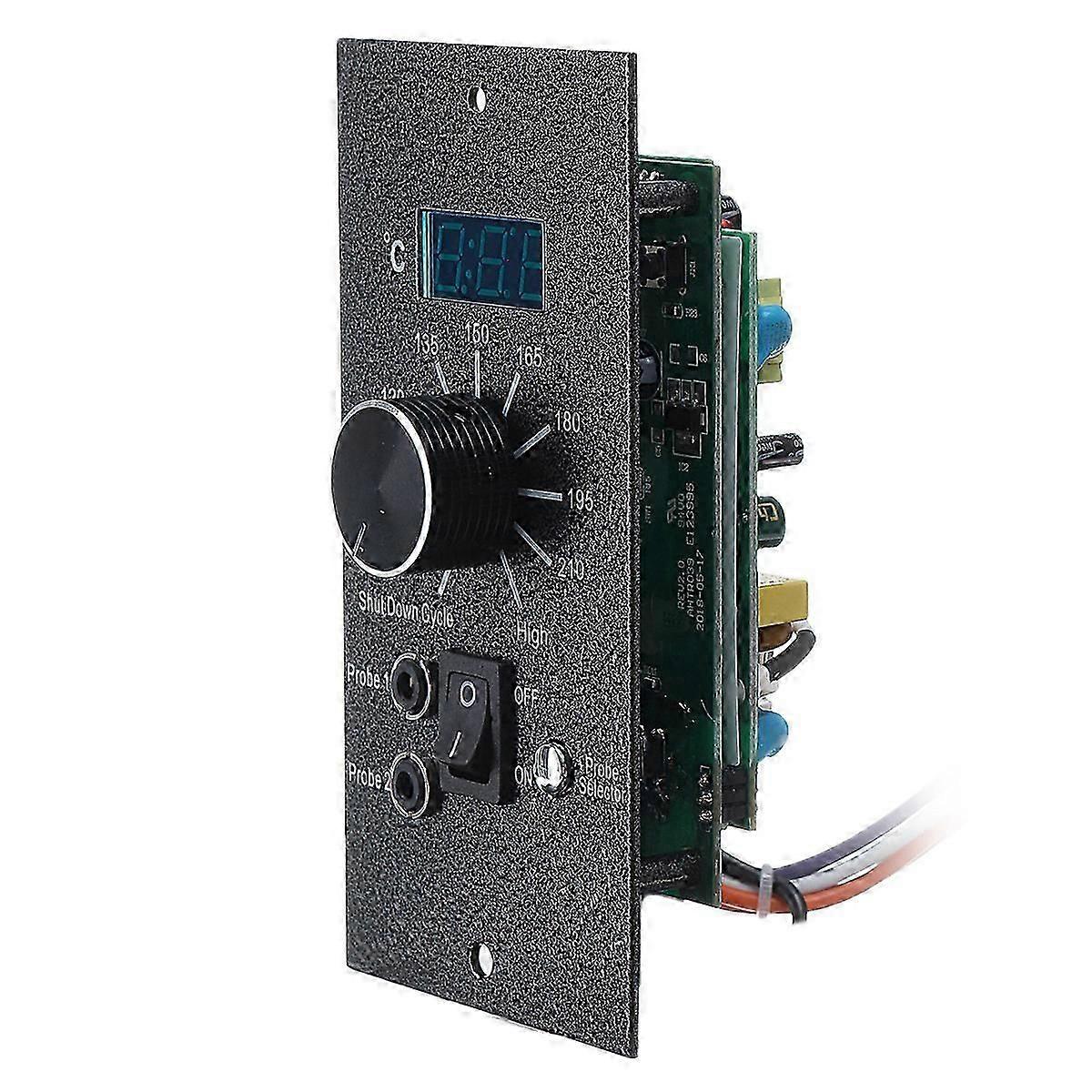 Easy ON/OFF Switch.Temperature control via rotary button Socket that supports dual RTD probes.It is convenient for you to control temperature High mode can be used for highest heat possible.Take full control of your pellet stove with this controller board Come with smoke mode and temperature modes from 105 Celsius to 210 Celsius .Features shut down setting for safe shut downs. (Fan keeps running, auger and igniter shut off). Dual meat probes interface so you do not lose your heat checking your meat's internal temperatures.(Meat Probes Not Included) Specification Motor: 6016# Voltage: AC 230v, 50Hz Installation method: Embedded Fitment: For TRAEGERS, etc Temperature Display:Celsius Total Load: up to approximately 250W Size: (L)X(W) 14X7cm /6inch X3inch(appr.) Suitable for furnace temperature probe: PT1000 Suitable for meat temperature probe: PT1000 Colour:Black Material:iron Size:14X7cm Package Contents: 1 * Thermostat Board Only the above package content, other products are not included. Note: Light shooting and different displays may cause the color of the item in the picture a little different from the real thing. The measurement allowed error is +/- 1-3cm. sku:219670457322