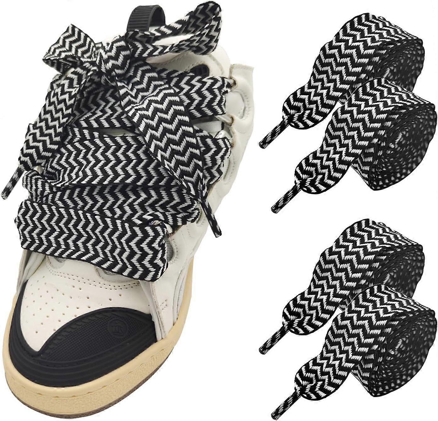 2 Pairs in a Pack: 2 pairs black+white jumbo flat shoe laces(4 laces),3/32 (3cm)wide, 54inch length. Our big thick shoelaces can choose from many lengths. Please check your original shoe laces length before buying.Fashion LookGreat old school look, these fat shoe laces belt are perfect for a vintage retro 80s look and give your favorite athletic shoes a new fashionable look.After-sale Service:We are so confident in our big fat wide laces that we will replace them for free if they would ever break! Welcome to Our Shop.Premium Material:Thick shoestrings are made of Made from 100% organic cotton materials, fine and soft texture that won't add extra weight to shoes, comfortable and durable, full of texture!Compatibility: Perfect replacement shoelaces, same material as the original shoelaces, which will make your shoe laces brand new again.