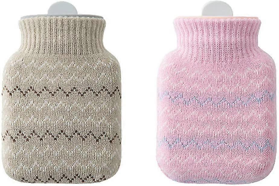2 Pack Silicone Thermos, Mini Portable Winter Microwave Heating Hot Water Bottle with Cute Knit Sleeve for Hand, Foot and Stomach Warmers for Pain Rel