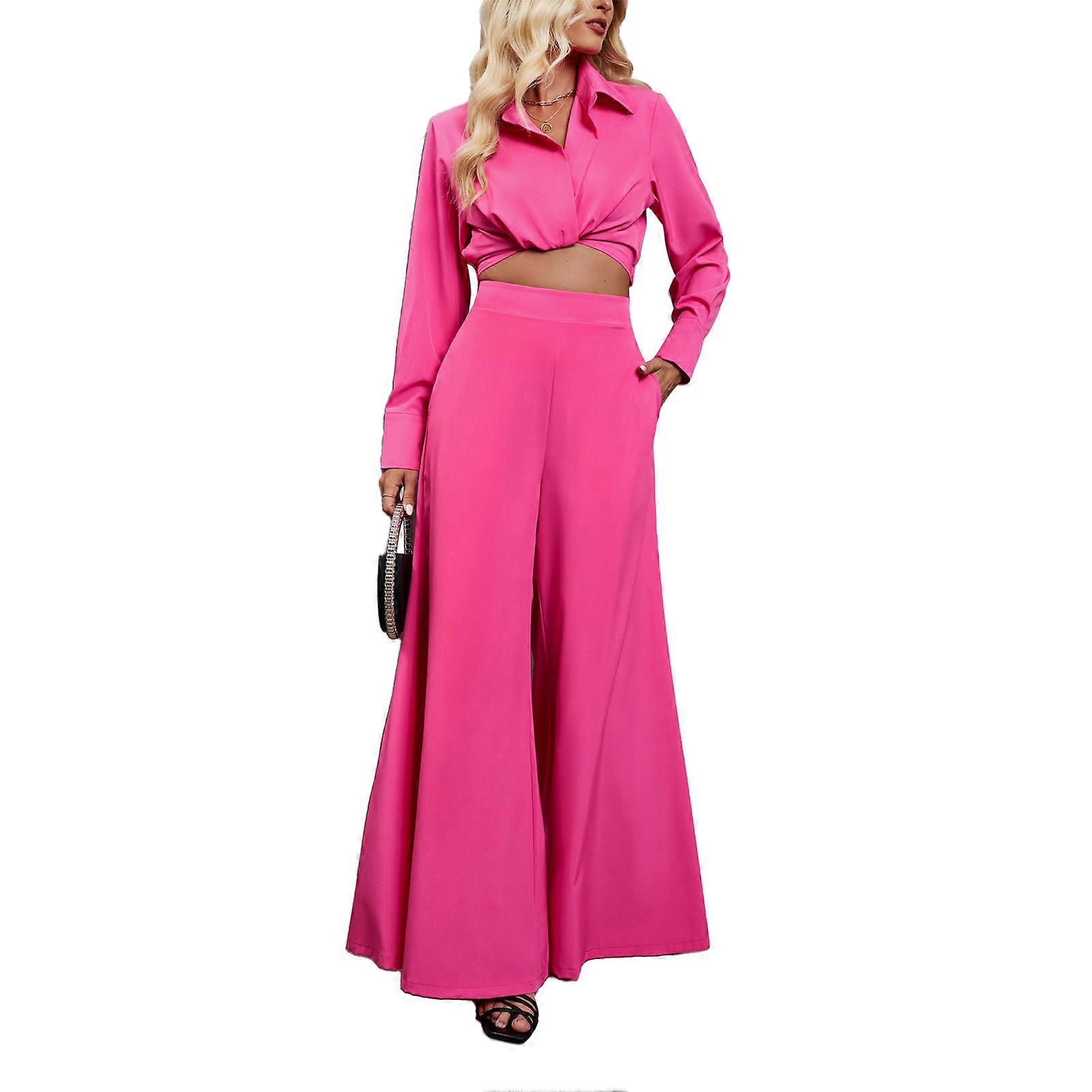 2 Pieces Long Sleeve Wide Leg Trousers Plain Color Fashionable Short Blouse Wide Leg Pants Set Rose Red L
