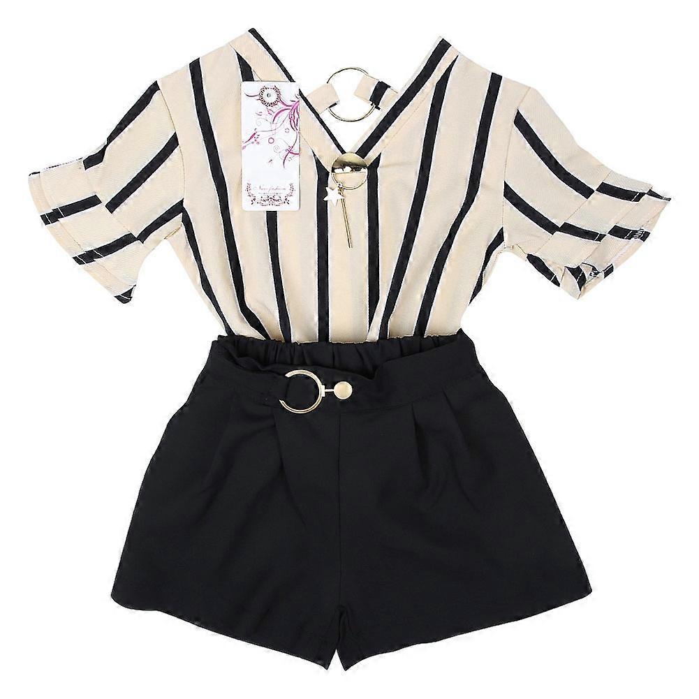 2pcs/Set Fashion Child Girl Strip Short Sleeve V-neck Shirt Pants for Spring Summer (Beige 90)