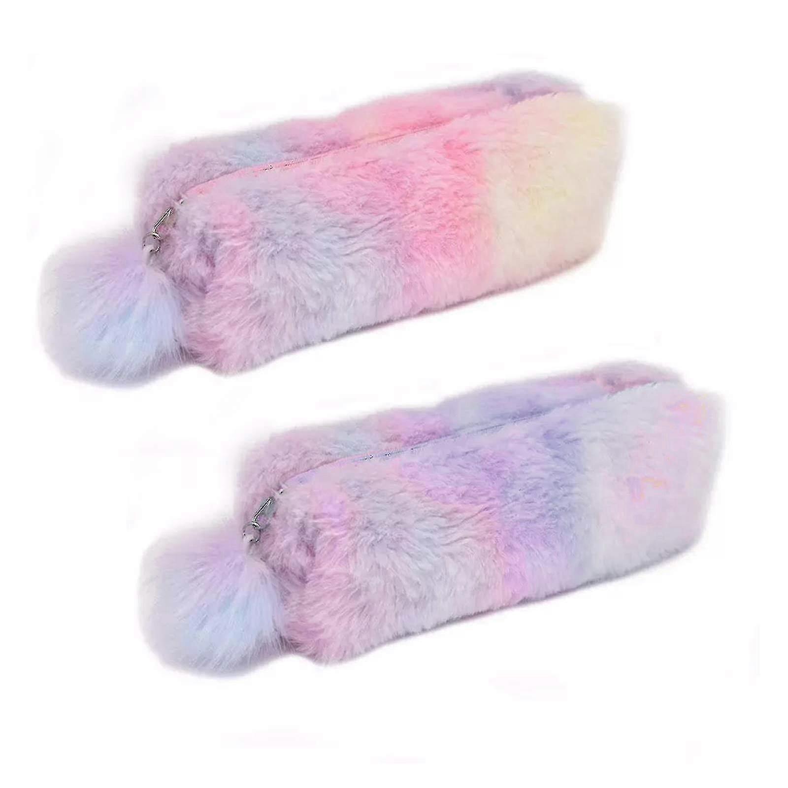 2pcs Plush Rainbow Pencil Case For Girls Fluffy Pencil Case Cute Rainbow Pencil Holder Soft Pencil Case Random Color