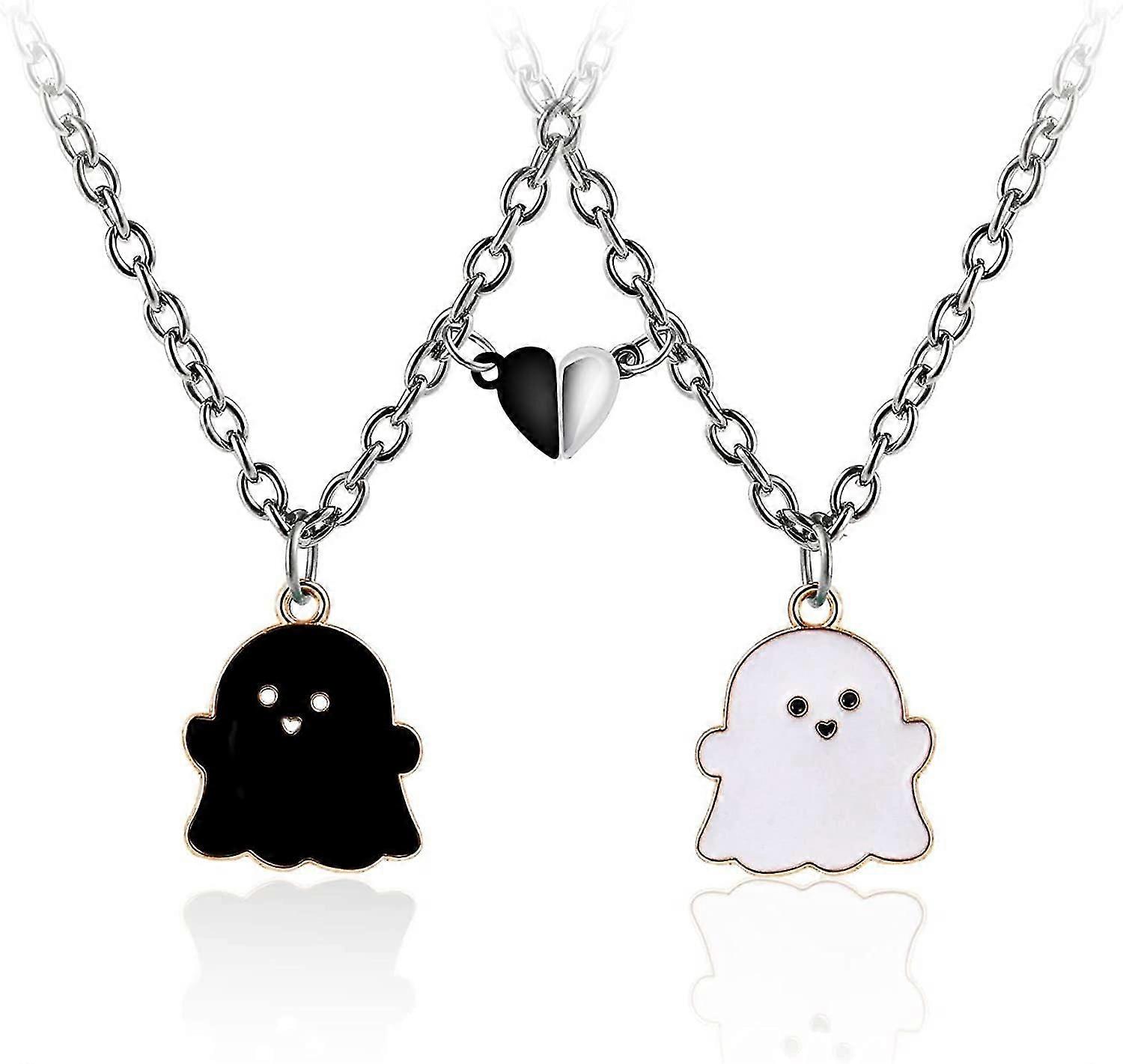 2pcs Lovely Magnetic Love Heart Ghost Pendant Necklace Set For Women Men Best Friend Girl Boy Teen Enamel Mutual Attract Magnet Couple Matching Neckla