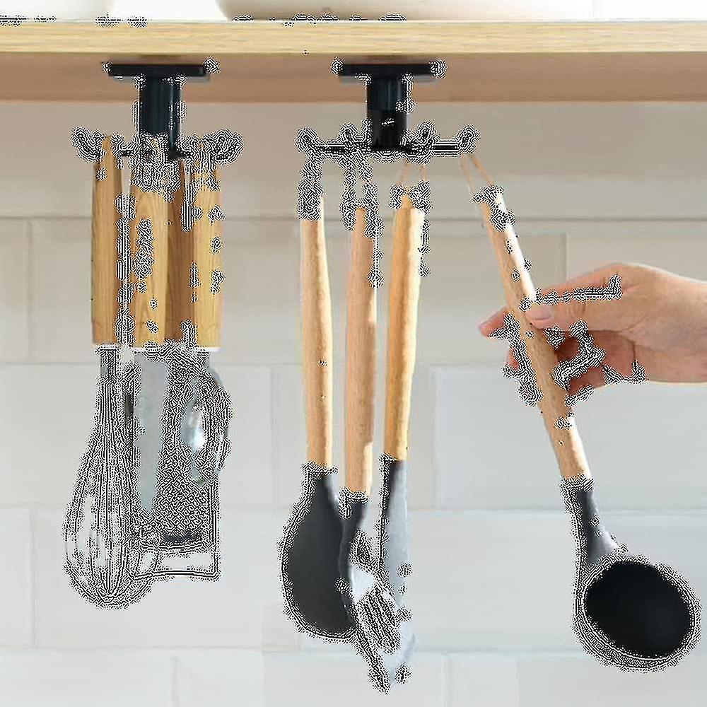 Nail-Free InstallationOur utensil hanging racks are drill-free and easy to install, simply slide this rack onto a cubicle or pantry shelf and tear off the protective film from the accessories to secure the rack, will not damage your walls and your closet. Good Loading CapacityThese hanging utensil hooks are made of good quality plastic with spray paint, the maximum loading weight is 2kg. 360 Degree RotationEach 360 degree rotatable kitchen hooks with 6 hooks can rotate 360 degrees, easy to hang and meet kitchen storage needs. Multi-functionThis kitchen utensil organizer is not only used in the kitchen, but also ideal for hanging keys, bags in the cupboard and other places. NoteAdhesive accessories Widely used on smooth and smooth surfaces, such as wood, tiles, ceramics, metal, plastic surfaces, etc. but do not install it on the uneven surface of the wall surface or on the dusty surface.
