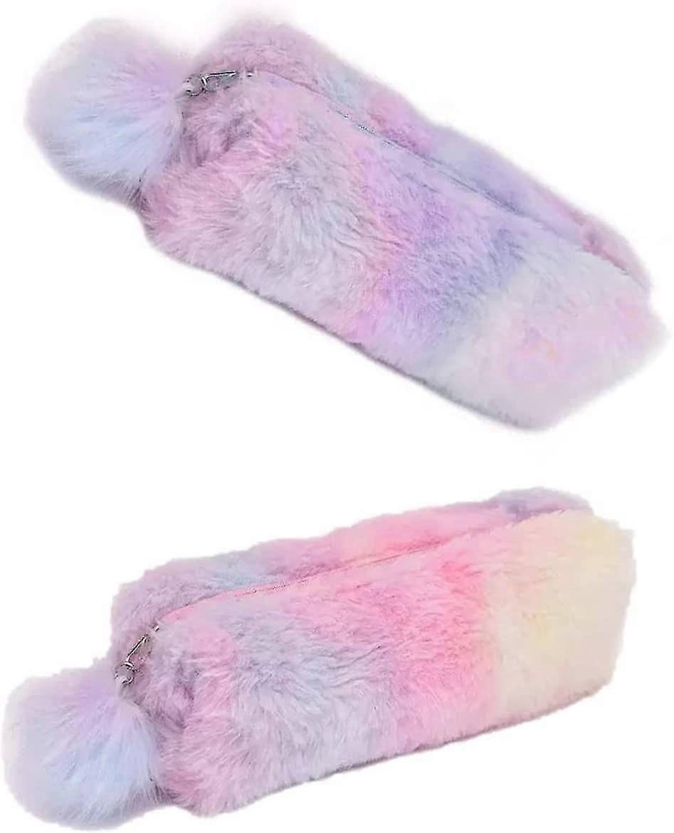 2 Pcs Rainbow Pencil Case Cute Pencil Holder Fluffy Pencil Bag Makeup Pouch For Student Teacher