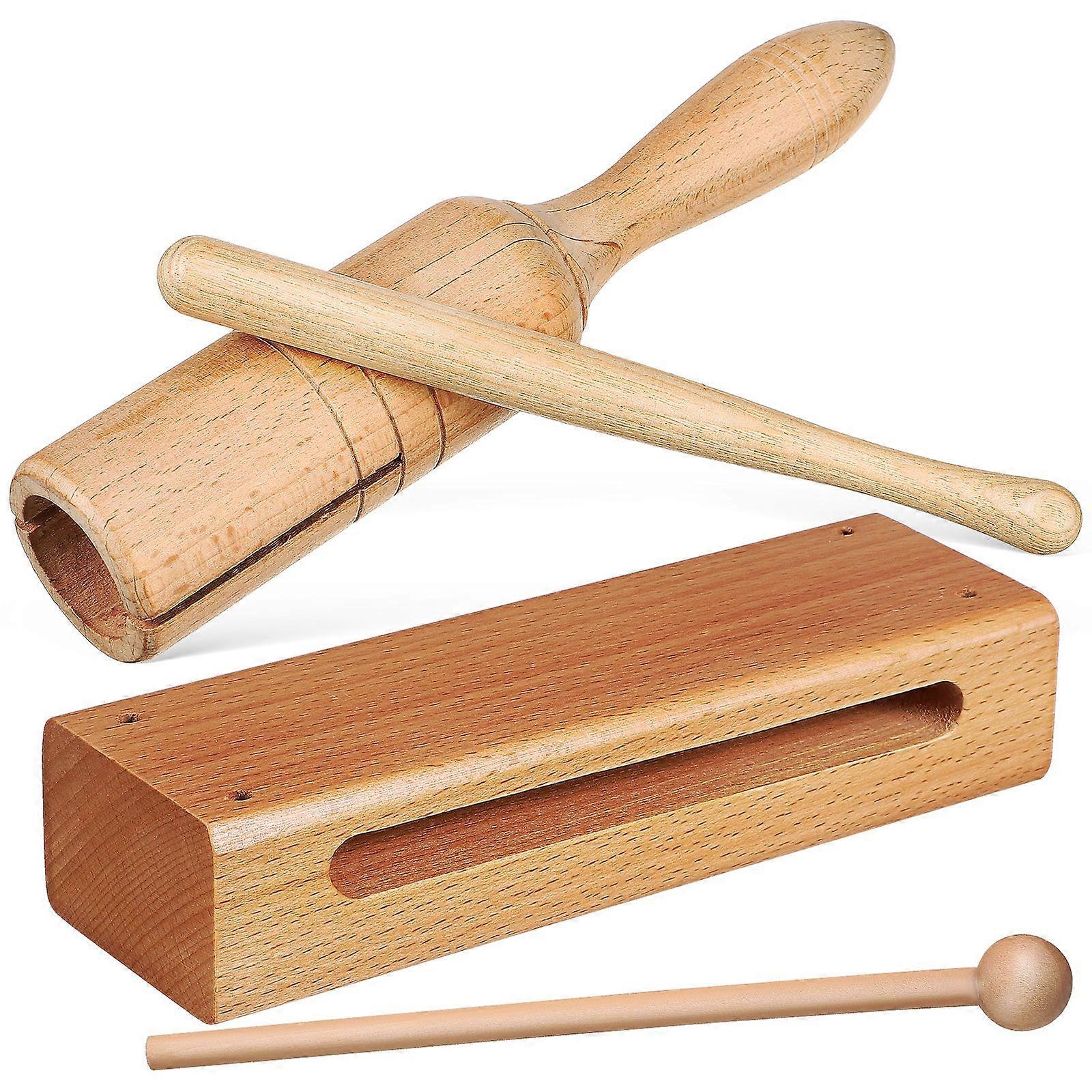 2 Sets of Single Tone Wood Block and Handheld Clapper Tube with Wooden Beaters Educational School Percussion Instruments