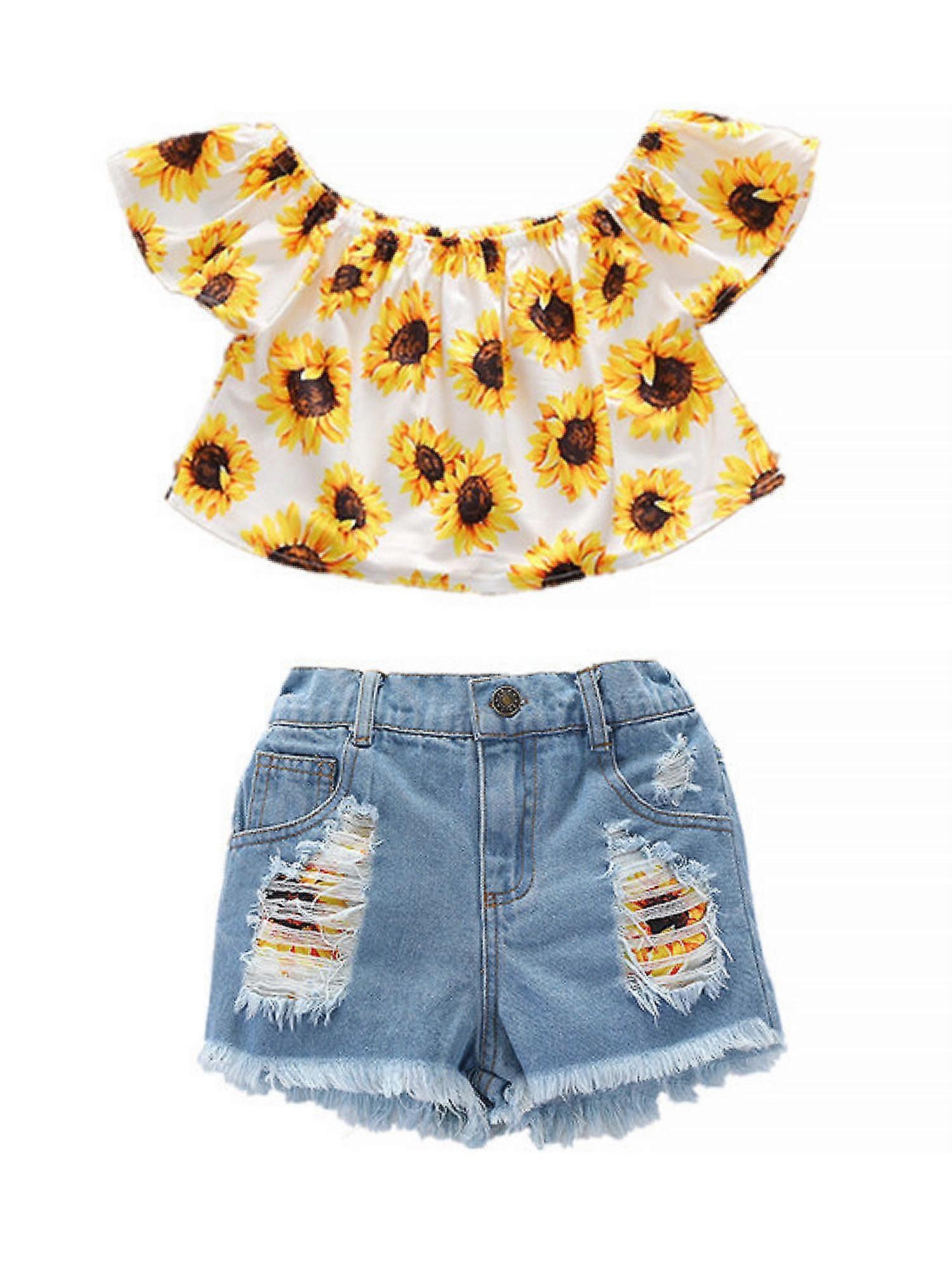 2-7 Years Girls Off Shoulder Tops Denim Shorts Pants Outfits Set