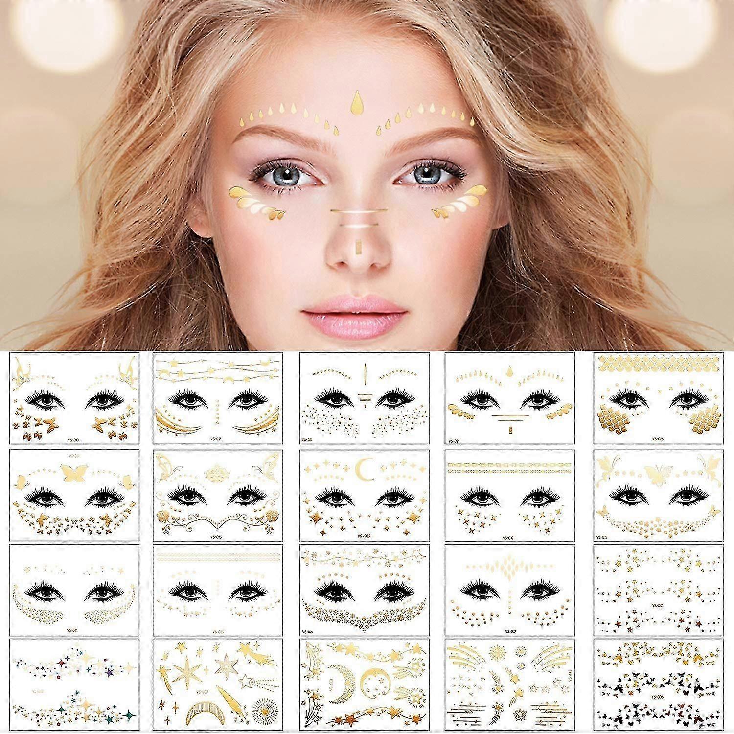 20 Sheets Face Metallic Temporary Tattoo Sticker, Face Gold Temporary Transfer Tattoo Freckle Sticker compatible Women Girls Halloween Makeup Dancer
