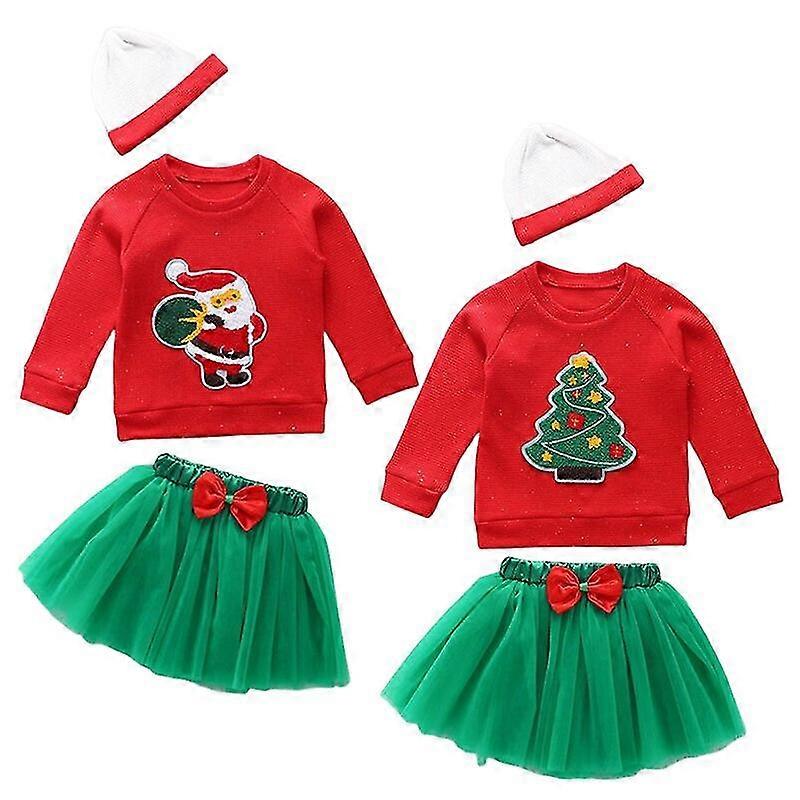 2022 Girls Christmas Clothing Cartoon Santa Pattern Red Round Neck Long Sleeve Sweatshirt+bow Tulle Tutu Skirt+hat