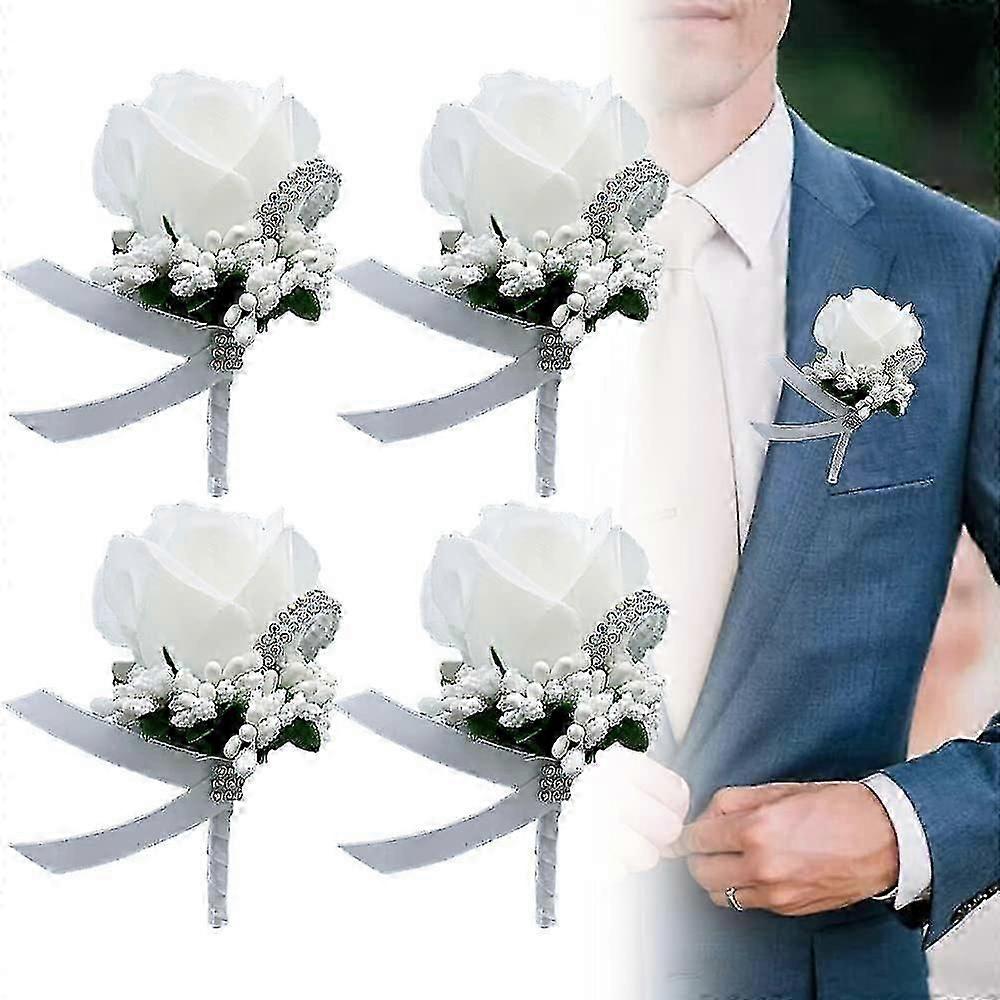 2024 4pcs Wedding Boutonniere White Rose, Rose Boutonniere Handmade Wedding Wrist Flower Corsage