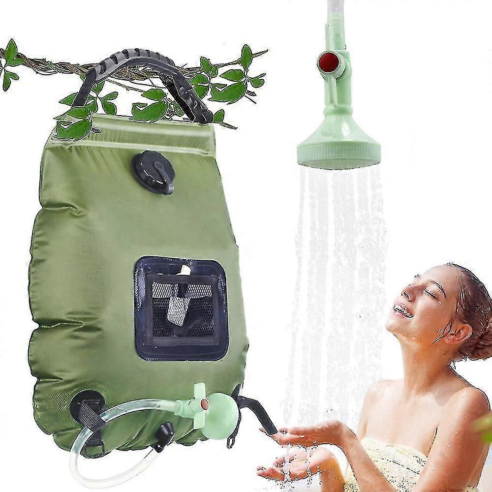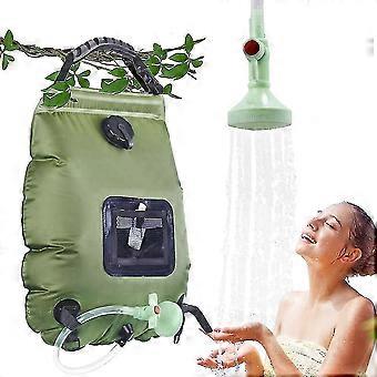 Product descriptionWater volume: 20L / 5 gallonsShower bag size: 35 * 15 * 8cmPackage Include:1 x solar shower bag 20L1 x hanging strap1 x plastic tube1 x shower head1.High Quality Materials - Camping shower bag is made of environmentally friendly materials that are safe for human health. This deluxe version with multiple layers can further improve the leakproof function and make it even more durable.2. Advanced Shower Head - These camping solar showers have an advanced shower head offering a simple on / off switch with low to high water flow. Brings you a much better shower experience.3.High water capacity - This portable shower bag can easily carry up to 20 liters of water for showering in remote areas. A nice and refreshing shower everywhere.4.Smart Heat Absorbing Design - The smart PVC material can efficiently absorb the solar energy to heat the water in the camping shower bag. It heats water to 45 C in 3 hours with direct sunlight.5. TEMPERATURE INDICATOR - A temperature display ( C / F) is attached to the 20L shower camping bag. Hose, shower head with on / off switch and tap included, 20L capacity bag with water temperature indicator, rolls up when not in use.