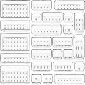 25 PCS Clear Plastic Drawer Organizers Set, 4-Size Versatile Bathroom and Vanity Drawer Organizer Trays, Storage Bins for Makeup, Jewelries, Kitchen U