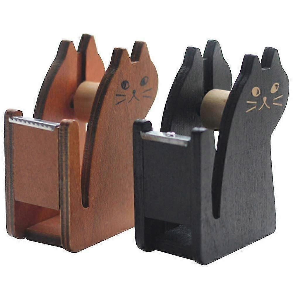2Pack Tape Dispenser-Vintage Wooden Cat Shape Desktop Tape Cutter (Black & Brown)