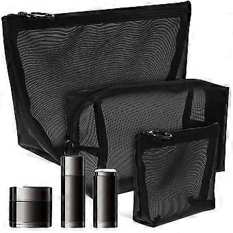 Description The mesh makeup bag is a versatile and practical accessory that is suitable for storing and organizing your makeup and toiletries. With its different sizes, it can accommodate a variety of items, making it ideal for different occasions and travel needs. Features -Color: Black -Material: Nylon - Size: 22.00X13.50X8.00cm/8.65X5.31X3.14in - Size: 18.00X11.00X6.00cm/7.07X4.32X2.36in - Size: 11.50X9.00X3.50cm/4.52X3.54X1.38in - Multi-functional: The mesh bag can be used to store other small items besides makeup and toiletries, making it a versatile storage solution. - Long service life: The toiletry bag is made of nylon materials that make it lasts for a long time, even with frequent use. - Easy to organize: The bag's large capacity design make it easy to organize your items, ensuring that everything is in its place. - Compact and portable: The bag's lightweight and compact design make it easy to carry around, making it suitable for travel. - Stylish and practical: The makeup bag's combination of style and functionality makes it a must-have accessory for anyone who loves beauty and makeup. Package list: 1 x makeup bag(large size) 1 x makeup bag(medium size) 1 x makeup bag(small size)