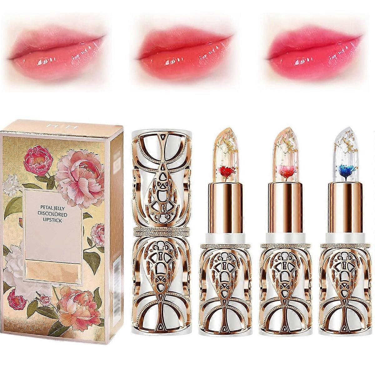3Pcs Petal Jelly Discolored Lipstick, Crystal Jelly Flower Color Changing Lipstick, Clear Lipstick with Flower Inside, Temperature Color Changing Lip