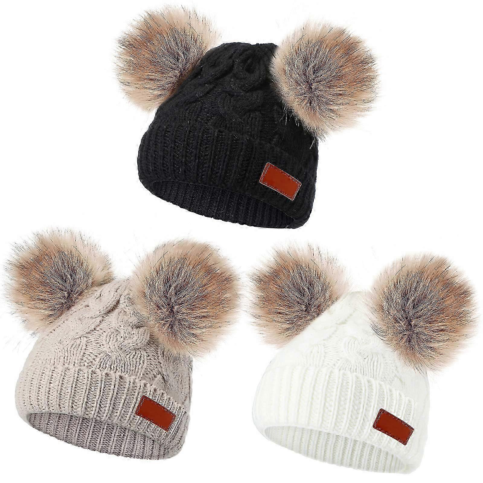 3 Pieces Kids Knitted Woolen Hat Winter Warm Pom Pom Beanie Cap Knit Hat with Detachable Pom for 1-3 Years Old Girls Boys