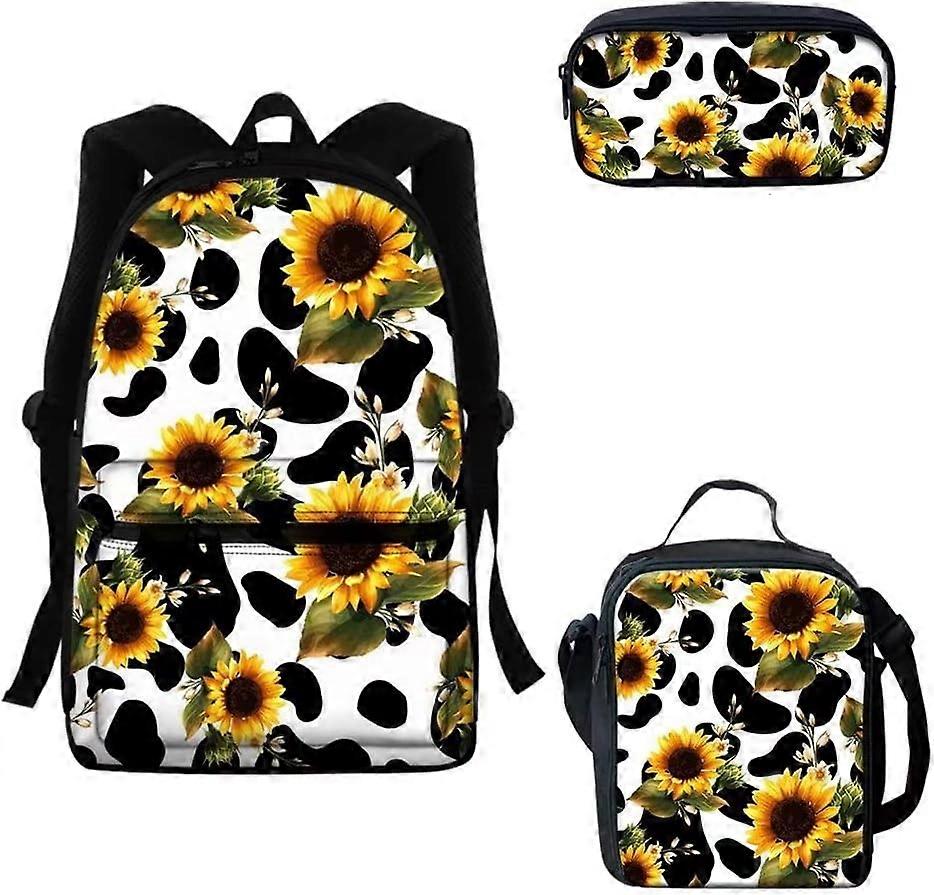 3 Pieces Yellow Sunflower Cow Pattern School Bags Backpacks Set for Kids Girls Shoulder Book Bag Casual Daypack with Lunch Box Pencil Case