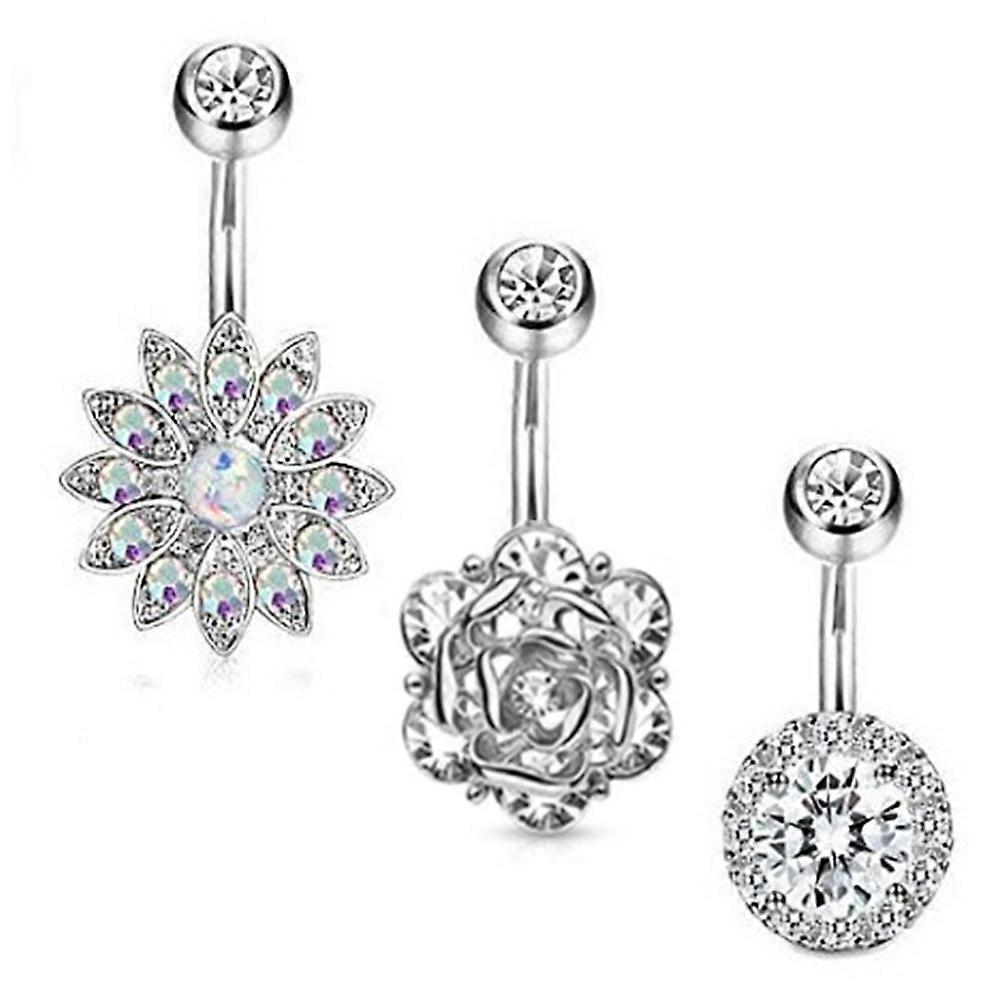 3Pcs Medical Steel Opal Belly Ring Navel Nail Body Piercing Jewelry Set (Silver)