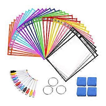30 قطعة جيوب ورقة عمل قابلة لإعادة الاستخدام واقيات صفائح بلاستيكية شفافة مقاومة للماء جيب PVC مع علامة ، ممحاة ، حلقات الموثق