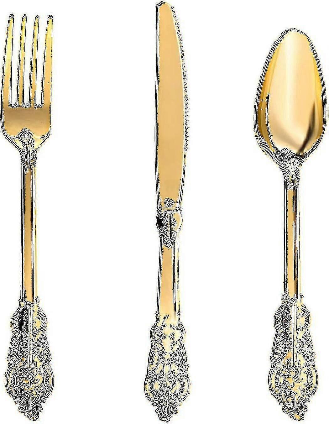 300pcs Gold Plastic Silverware Dinnerware Flatware- Heavyweight Gold Plastic Cutlery Set, 100 Gold Forks, 100 Gold Spoons, 100 Gold Knives, Gold Utens