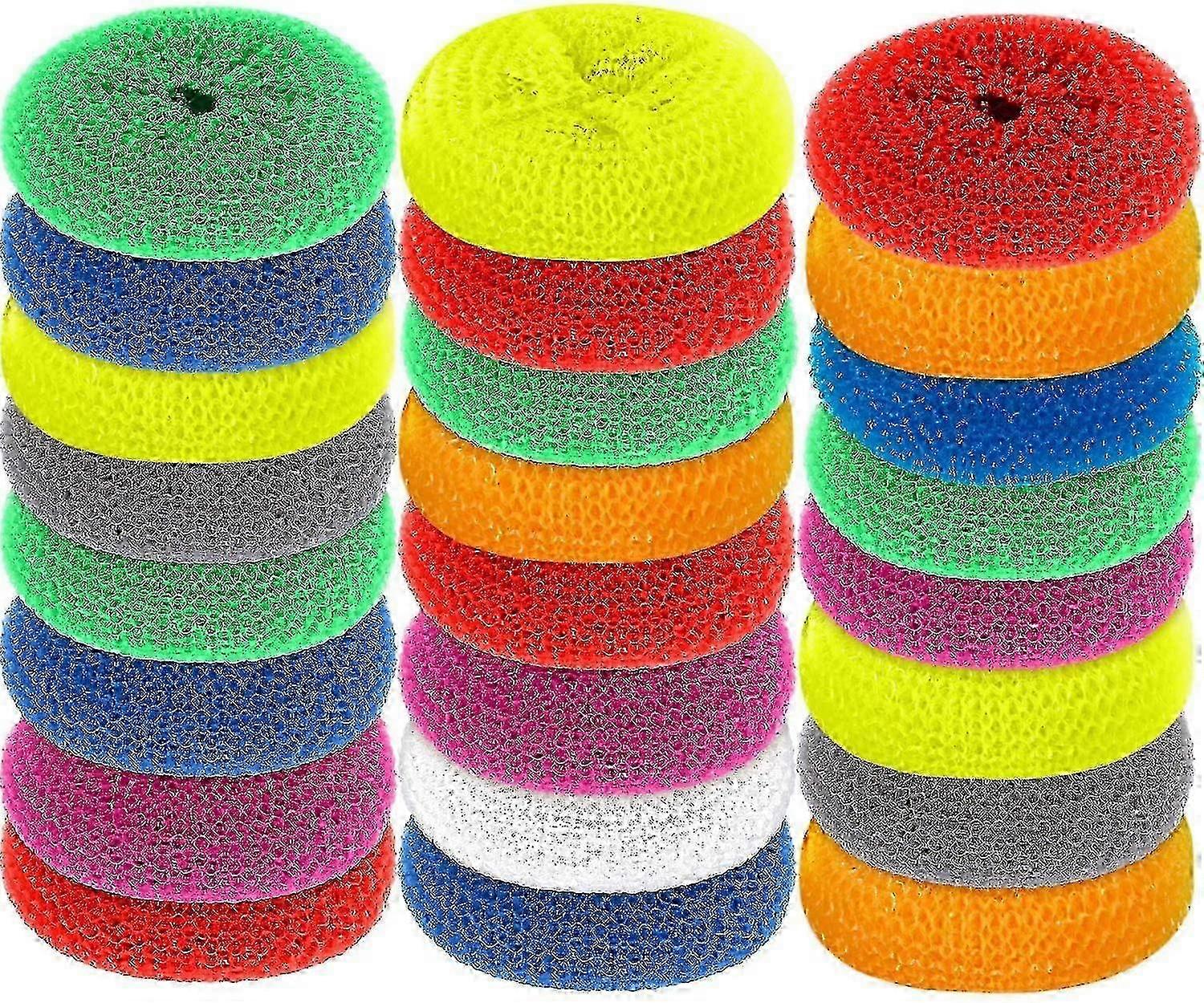 Quantity: 30 pieces of round dish scouring pads in different colors, enough quantity for your daily use and convenient to change, bright colors bringing you a good mood when you do the dishes Convenient design: the plastic dish scrubbers are designed with a hole in the middle, you can combine them with cleaning handles of various styles, tightly woven, they are not easy to be wiredrawn or fall apart Non-scratch: the plastic dish scouring pads are flexible and soft, which will not leave scratches on your pots and pans even if you scrub hard, they can help you clean up grease dirt, burn marks and other stains Durable material: the colorful round cleaning pads are made of polypropylene, safe and durable, suitable for long-term use, they are about 3.1 inches in diameter, small and easy to store, taking little space Wide use: our assorted color mesh scrubbers can not only clean pots, plates, bowels and other tableware, but also can be applied to clean up kitchen ventilator, sink, oven, refrigerator and more other places, making your home clean and tidy
