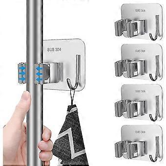 4 Pack Mop Broom Holder, Wall Mount Stainless Steel No Drill Mop Holder With Hook, Mop Broom Organizer For Bathroom, Office, Kitchen, Closet, Garage (