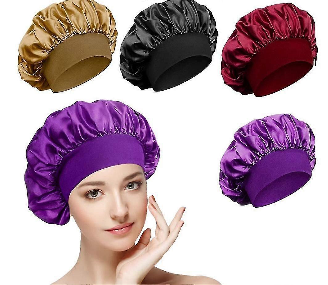 4 Piece Satin Nightcap Burgundy+black+deep Purple+gold, Nightcap Satin Nightcap Wide Elasticated Soft Nightcap For Women With Long Curly Hair