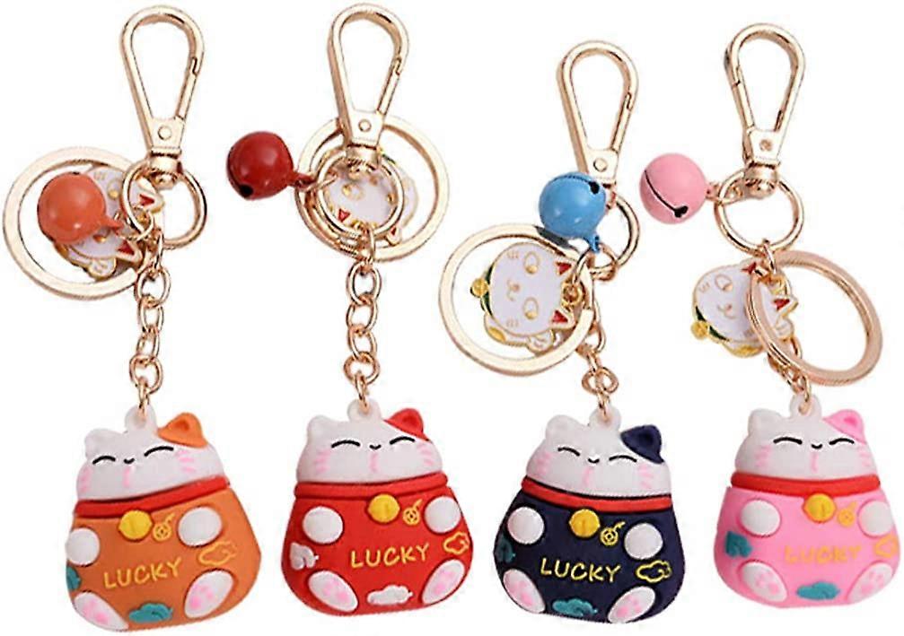 4PCS Lucky Cat Keychain with Bells Pendants Japanese Fortune Lucky Beckoning Cat Maneki Neko Keyring Soft Plastic Bag Charms Key Ring Pendants for Han