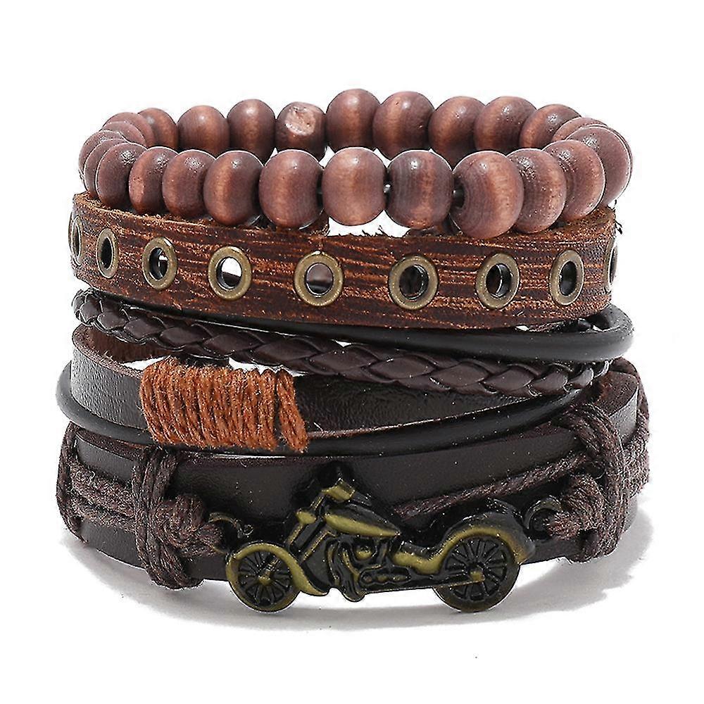 4pcs/ Set Braided Wrap Leather Bracelet For Men Vintage Life Tree Rudder Charm Wood Bead Ethnic Tribal Wristband Rope Bracelet