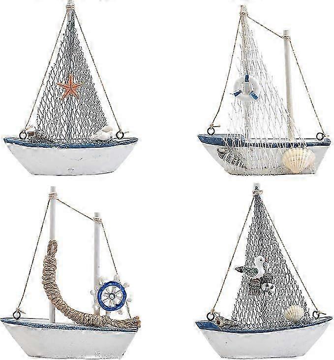 4PCS Mini Sailboat Model Decoration Wooden Miniature Sailing Boat Home Decor Set, Beach Nautical Design, Navy Blue and White