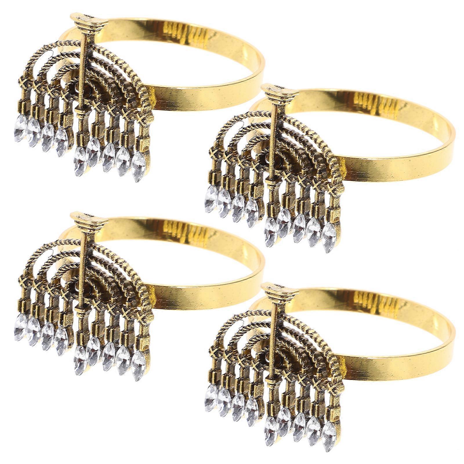 Description Add a touch of luxury and romance to your dining table with these exquisite Candle Holder Napkin Rings. Made from alloy and adorned with simulation diamonds, these rings are both delicate and durable. The unique design making them a versatile addition to your table setting. The antique color is simple yet elegant, making them perfect for any occasion. Features -Color:Golden -Material:Alloy -Size:4.60X4.00X3.00cm/1.81X1.57X1.18in -The simple and stylish appearance makes it a versatile choice for any occasion and decorative style. - Its compact size makes it suitable for various sizes of napkins, providing convenience and efficiency. - With just a gentle clasp, the napkin can be securely fastened to the table, preventing it from slipping off. - This versatile napkin ring is not only ideal for restaurants but also perfect for family gatherings, parties, and other occasions, enhancing the overall dining experience. - These Napkin Rings can be used repeatedly, the exquisite look will not go out of style. Package List4 x Napkin Rings