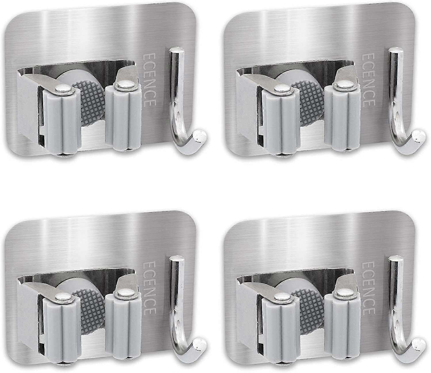 4x Self Adhesive Tool Holder With Broom Holder Hooks, Wall Mount For Kitchen, Laundry, Bathroom, Universal Quick Mount Holder Silver